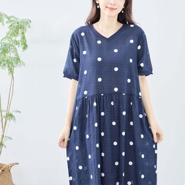夏の素材感の着やすさと ドット柄デザインが 魅力のワンピース ギャザーが高めに入ったデザインなので スタイルが良く見えます。 ネックラインと袖口部分がニット素材になったデザイン。 両サイドポケット付き。 綿100%のさらさら素材で 夏、 快適に着用できます 大人っぽい雰囲気を叶えてくれます
