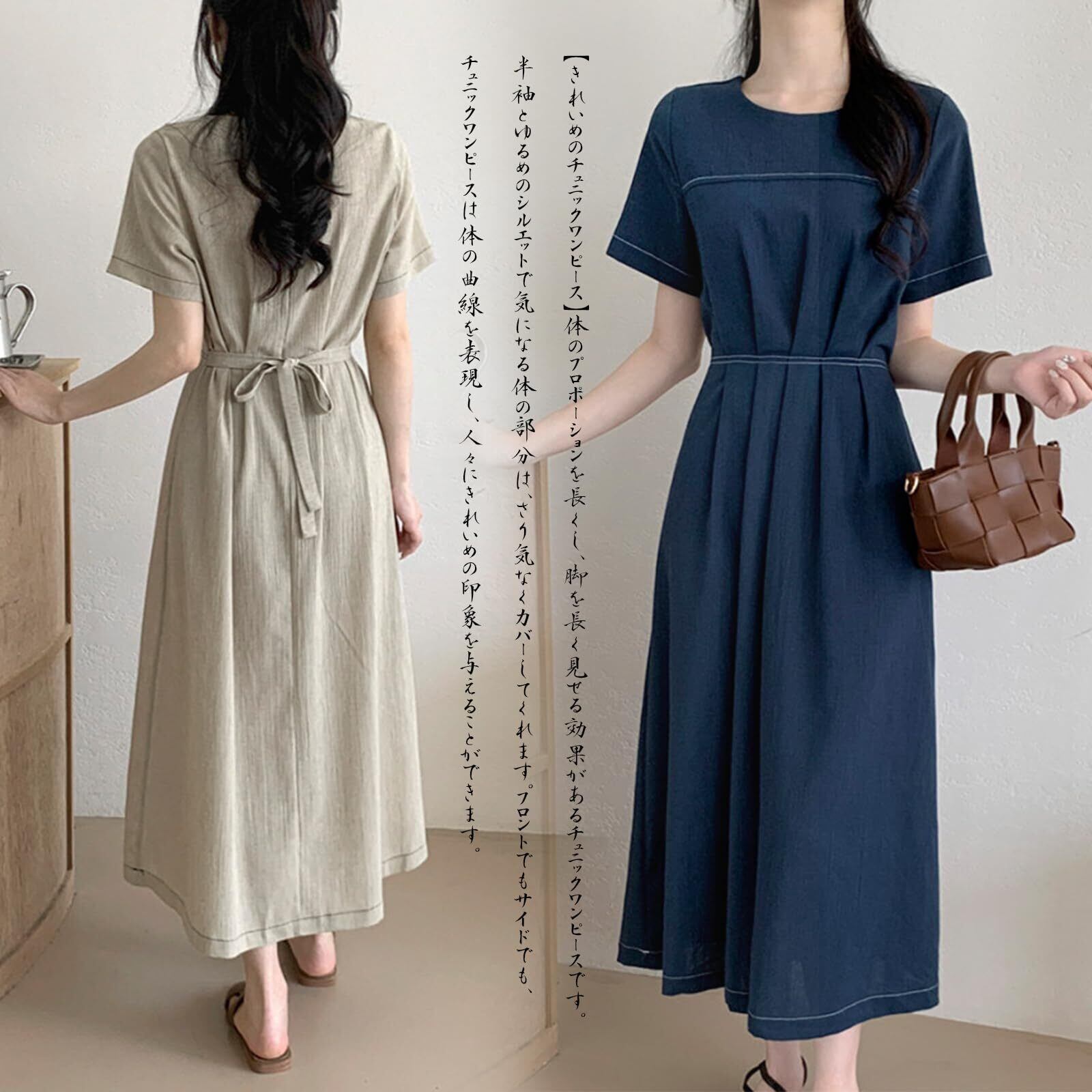 【きれいめのチュニックワンピース】体のプロポーションを長くし、脚を長く見せる効果があるチュニックワンピースです。半袖とゆるめのシルエットで気になる体の部分は、さり気なくカバーしてくれます。フロントでもサイドでも、チュニックワンピースは体の曲線を表現し、人々にきれいめの印象を与えることができます。また、すっきりとしたラウンドネックで顔周りとデコルテラインもきれいに見え、小顔効果もあります。