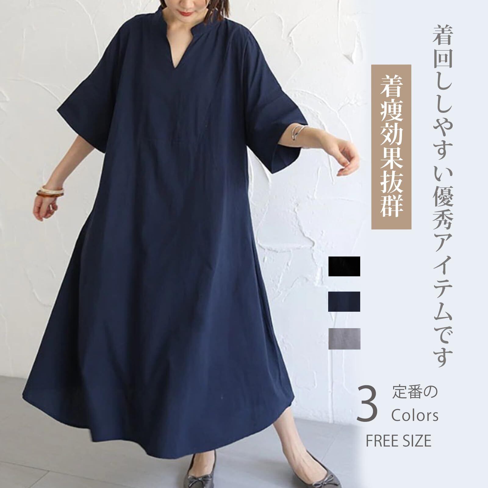 【2022最新】[ORWZDCO] ワンピース レディース ロング 半袖 Vネック Aライン 体型カバー 着痩せ 無地 カジュアル レトロ エレガント通勤 普段着 オフィス 春 夏 秋 | BOSSO