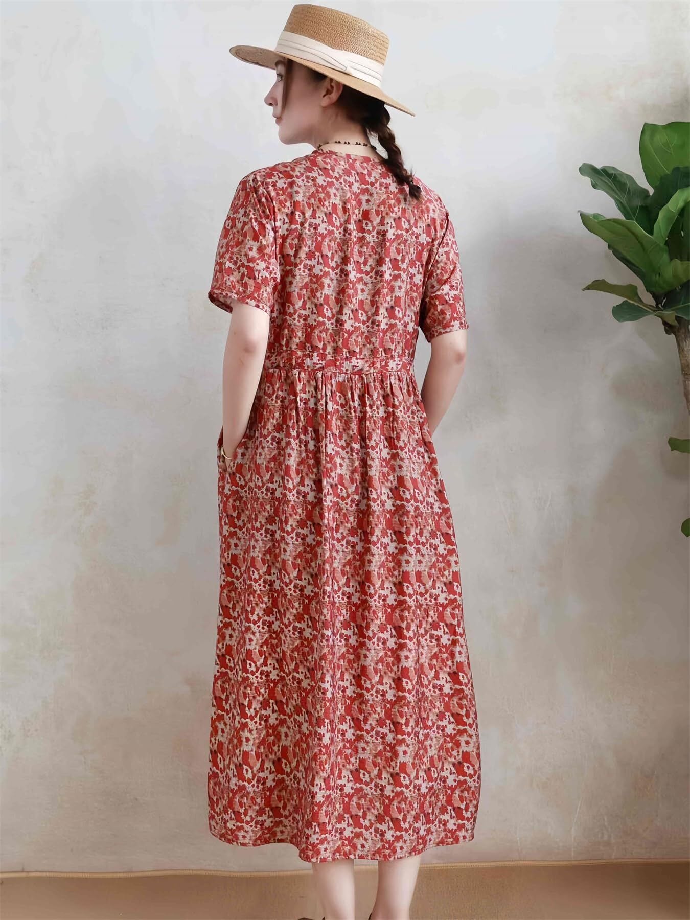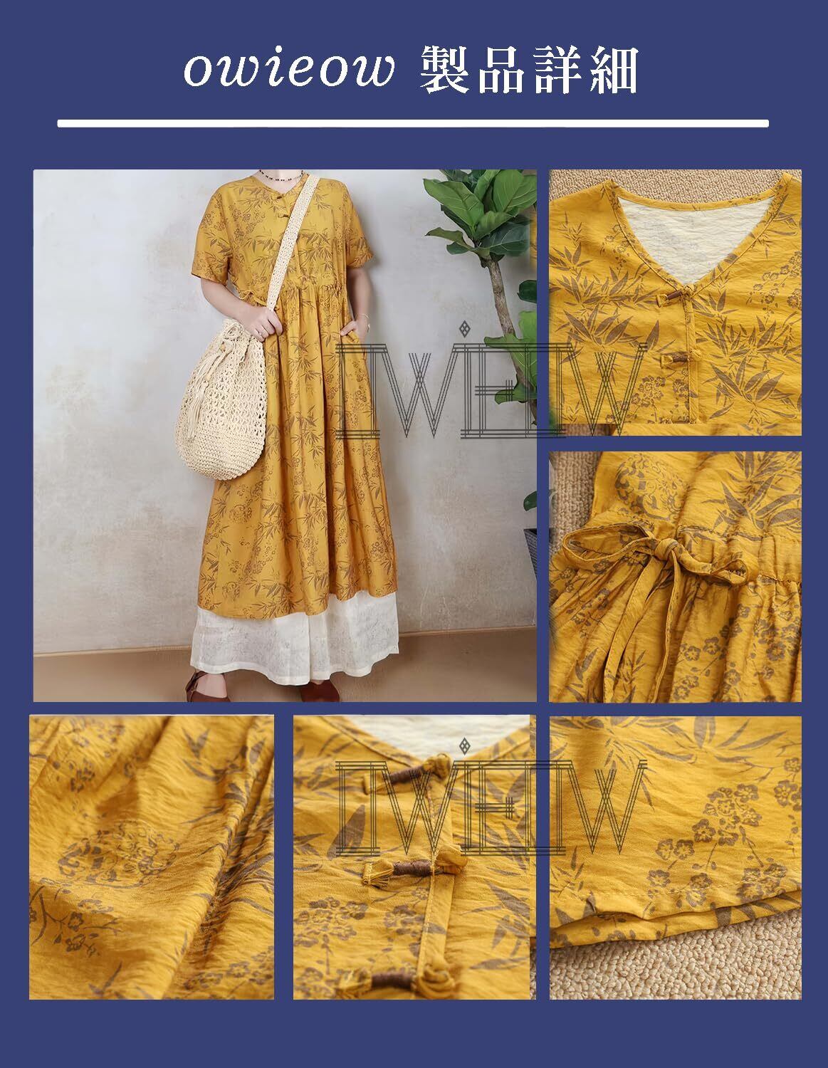 [OWIEOW]ロングワンピース レディース 花柄ワンピース 半袖 春夏 Vカラーリ 森ガール ゾートワンピース 綿麻 体型カバー きれいめ 涼しい 人気 大きいサイズ ゆったり 旅行 カジュアル