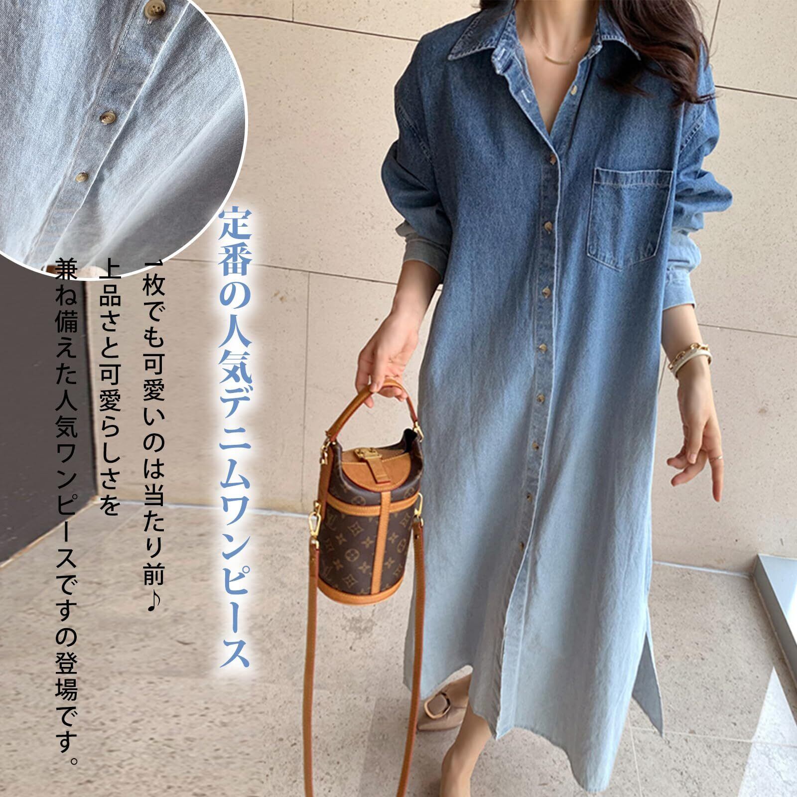 [7-livehouse] ワンピース レディース デニムワンピース 長袖 ロング丈 シャツワンピース 前開き デニム ロングワンピ 襟付き 2WAY ゆったり 体型カバー スリット 無地 お出かけ 通勤 春 秋 冬