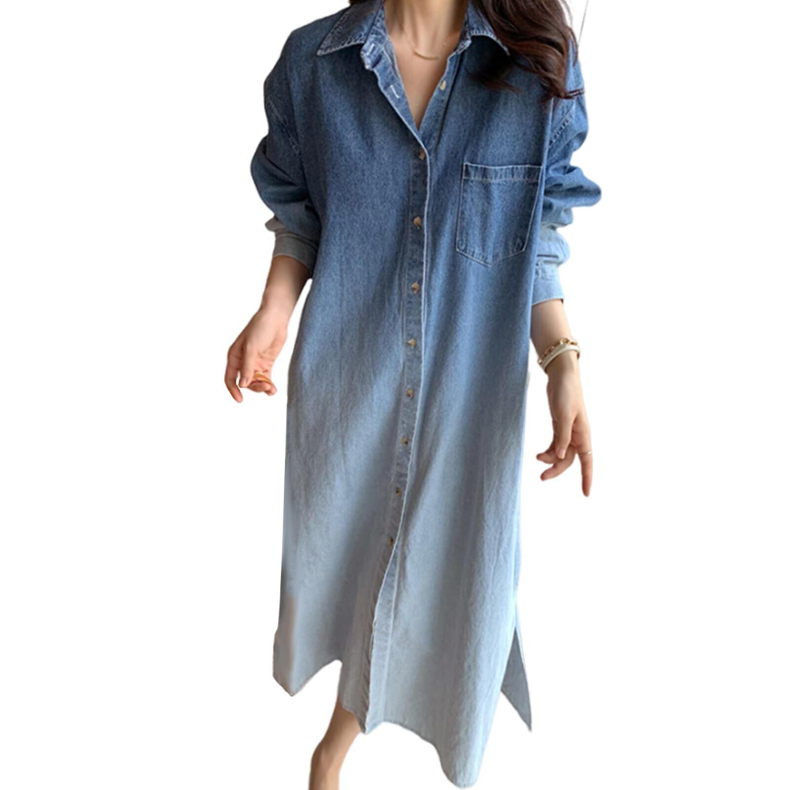 【数量限定】[7-livehouse] ワンピース レディース デニムワンピース 長袖 ロング丈 シャツワンピース 前開き デニム ロングワンピ 襟付き 2WAY ゆったり 体型カバー スリット 無地 お出かけ 通勤 春 秋 冬 | BOSSO