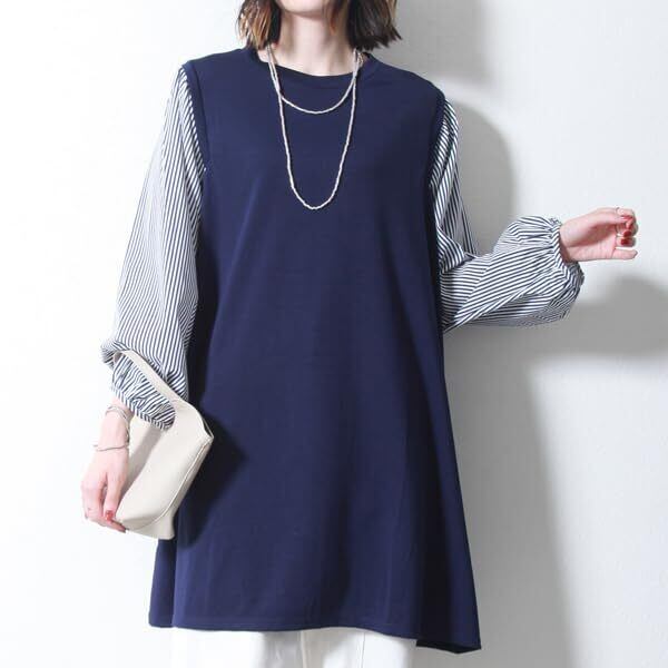 ふっくらボリューム袖がおしゃれ 重ね着風に見えるワンピース ふわっと膨らんだ袖が 女性らしくかわいいデザインです。 ストライプの生地とひかえめに艶めく 微光沢な生地が掛け合わさり 高見え効果を発揮します。 身頃はカットソー素材で伸縮性のある 着心地の良い素材感 お好みのボトムと合わせて おしゃれスタイルに