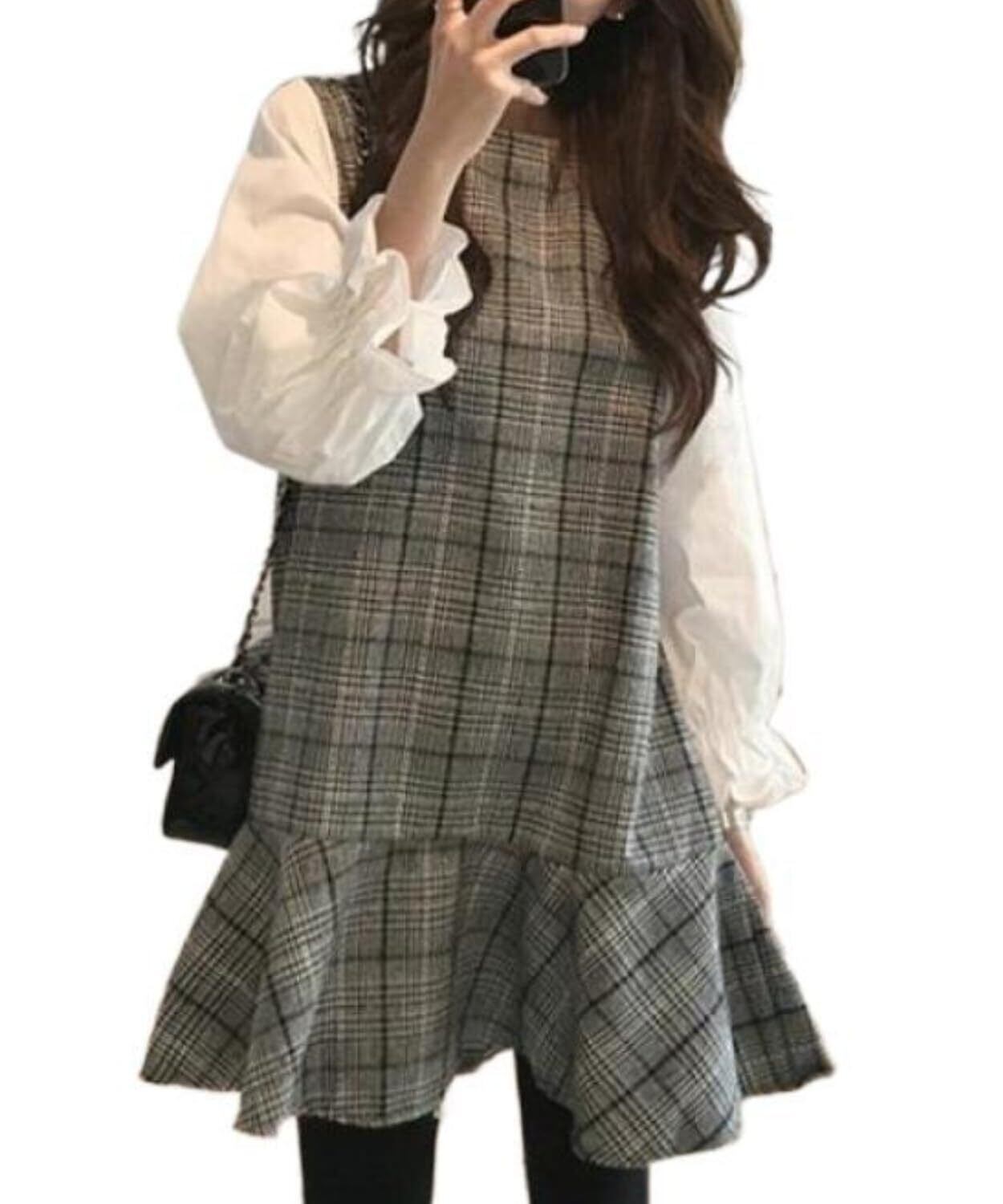 【在庫セール】[Riaminy] [リアミニィ] 重ね着風 ワンピース 切り替え レイヤード風 チェック柄 ゆるふわ レディース ミニ aライン 異素材 コンビワンピース フリル 春 秋 冬 おしゃれ きれい | BOSSO