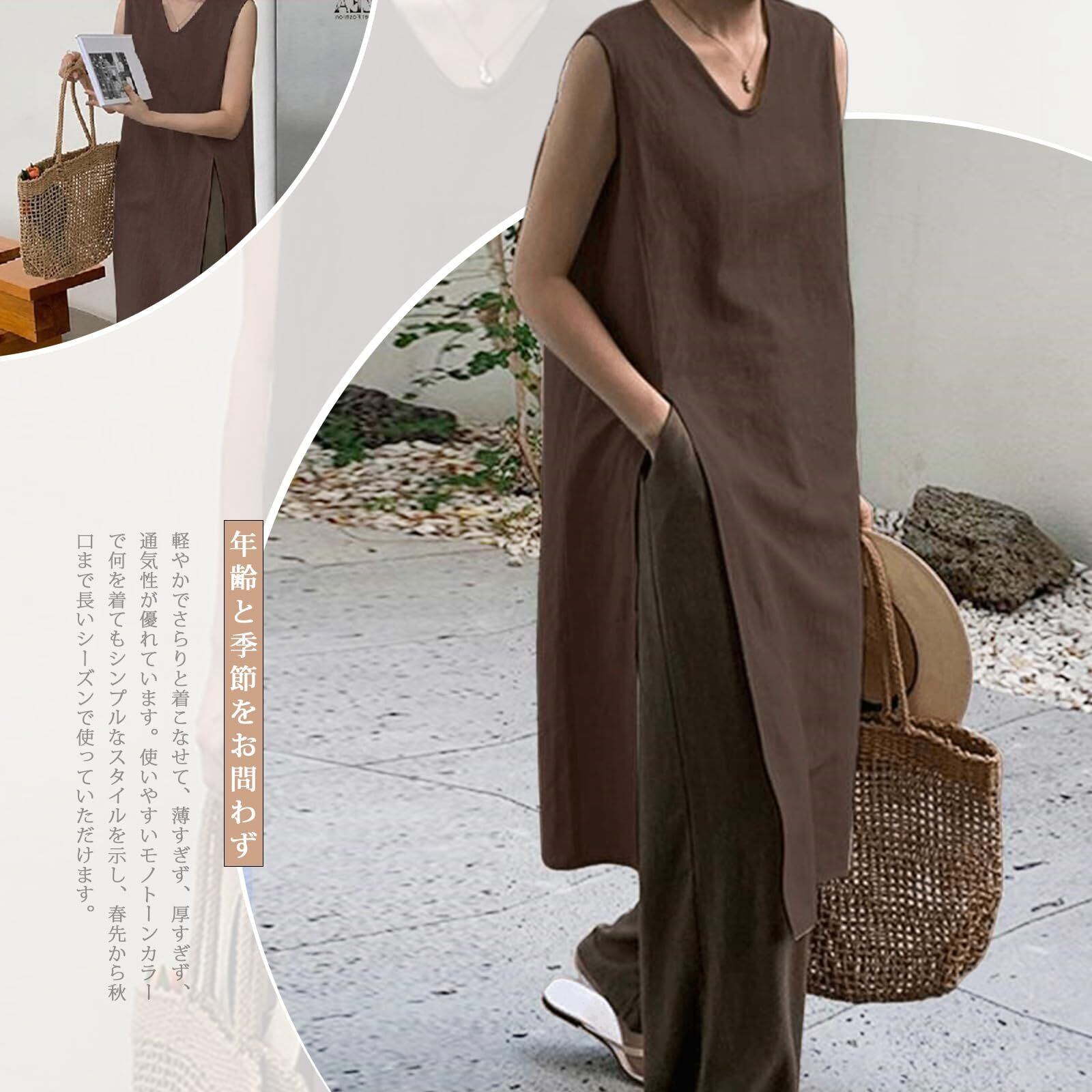 [Vmiutyer LLOP] ワンピース レディース ノースリーブ 綿麻 サイドスリット Vネック 大きいサイズ 上品 カジュアル きれいめ ゆったり リネン ロング 着痩せ 体型カバー 無地 通勤 オフィス ミモレ丈 夏 秋