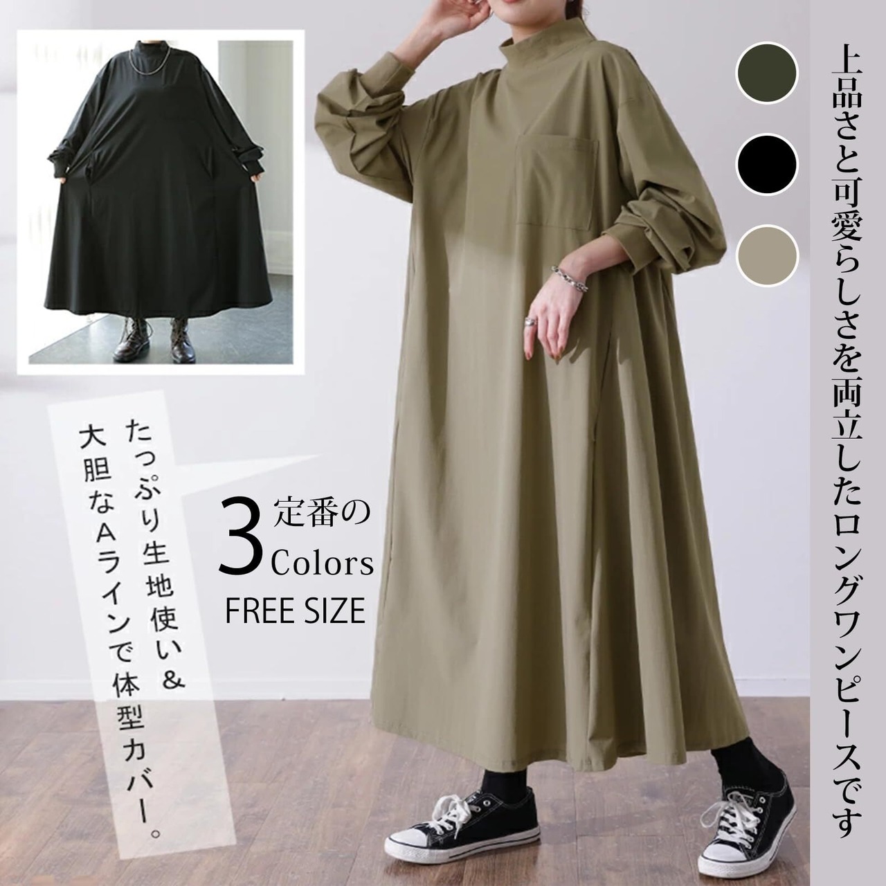 [ORWZDCO] ワンピース レディース 長袖 ロングワンピース ハイネック 上品 無地 ポケット付き 大きいサイズ ゆったり 体型カバー 着痩せ カジュアル 韓国 ファッション 大人 普段着 オフィス 通勤 春 秋 冬