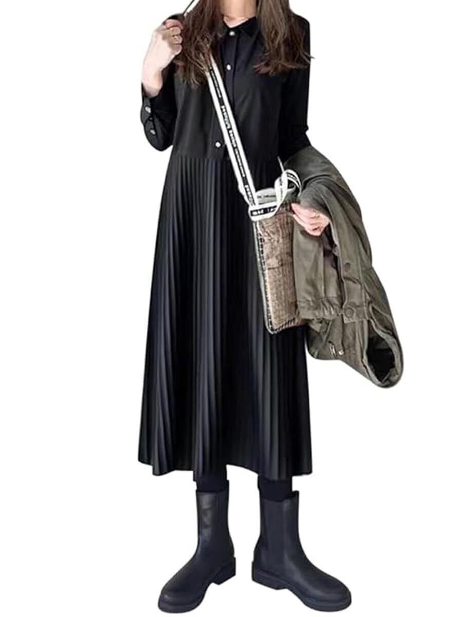 【特価セール】[SvaYvee] シャツワンピース レディース ロングワンピース ミモレ丈 Aライン 襟付き 長袖 無地 プリーツ ワンピース 着痩せ 可愛い おしゃれ 春 夏 秋 冬 ブラック S | BOSSO