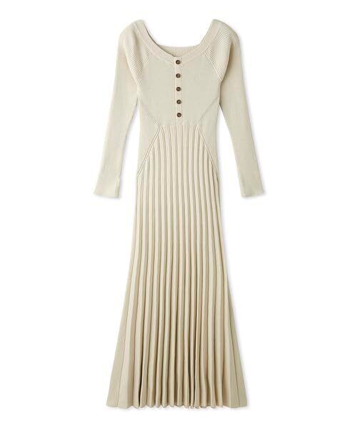 過去にご好評いただいたラメニットワンピースが、初期の復刻版デザインで再登場。ウエストのくびれを美しく演出するメリハリのあるシルエットに、フロントボタンでワンポイントデザインを加えました。肩を落としてオフショルダーとして着用できるほか、前後どちらでも着用可能で、Vネックとスクエアネックの2通りのデコルテラインを楽しむことができます。