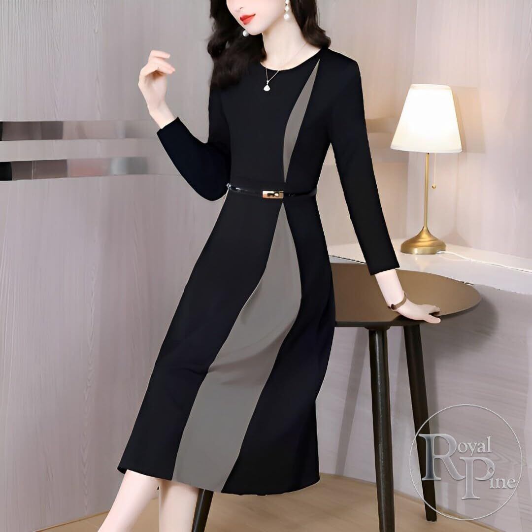 [Royal Pine] ワンピース レディース 春 秋 冬 きれいめ 長袖 Aライン ミモレ丈 ラウンドネック ハイウエスト バイカラー ベルト付 2色 4サイズ