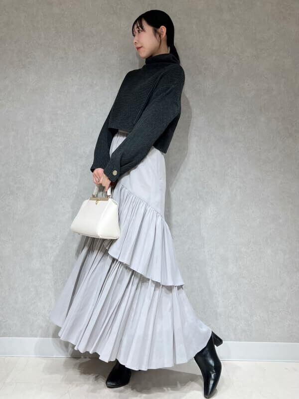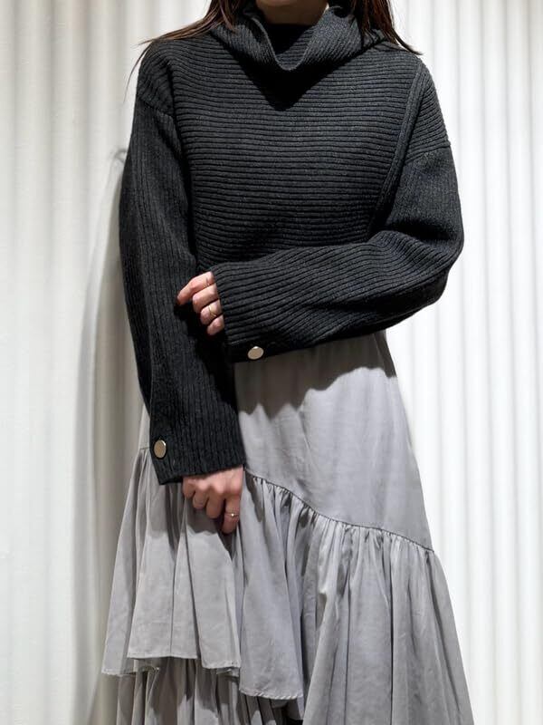 ゆるクロップド丈ニットトップスとふんわりティアードスカートの着回し力抜群なセットアイテム。昨年も大好評のコンビが再び登場します。ざっくりと着られる使い勝手の良いニットトップスは、リブ編みを切り替えたアシンメトリーデザインや、クロップド丈でこなれ感を出しました。衿の高さも変えていて一枚でサマ見えに。袖には品の良いゴールドボタンを添え、所作を美しく見せてくれます。お手持ちのスカートとも合わせやすいシンプルなデザインが魅力です。アシンメトリデザインが華やかなティアードスカートは、ヴィンテージ感のある表情の軽やかなマテリアルをたっぷりと使ってボリュームを出しました。ウエスト後ろ側はゴムシャーリングで仕上げ、着心地良く仕上がりました。セットで着用いただくことでレディなスタイリングが完成。それぞれ単品でも着回し力が抜群です。