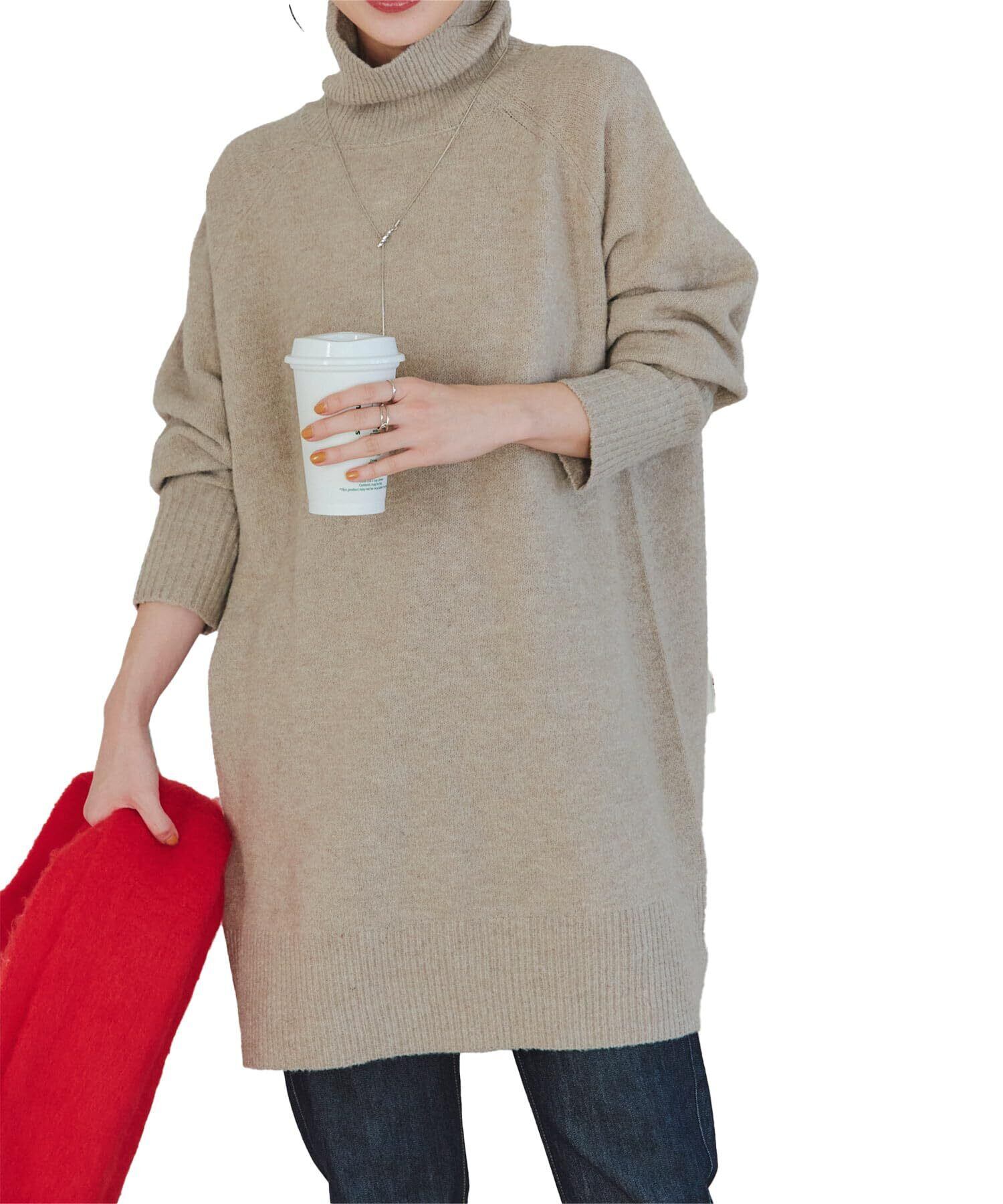 ふんわりとニュアンスのある風合いが魅力のスフレニットワンピース。もっちり柔らかな着心地と暖かさが冬に手放せない一着。楽ちんなのに一枚で可愛く着れるのでデイリーユースから旅行などの移動にもぴったりなタートルワンピです◎