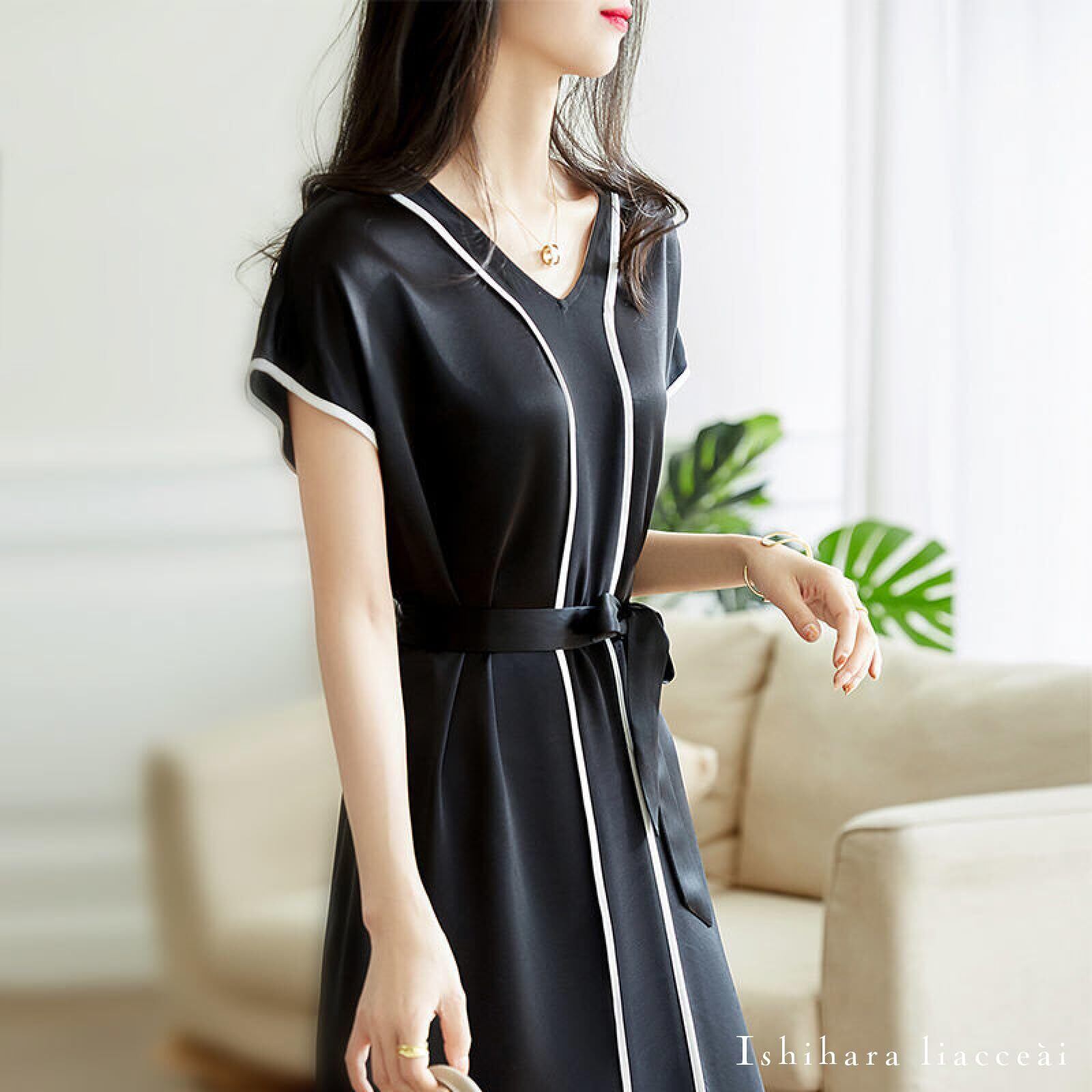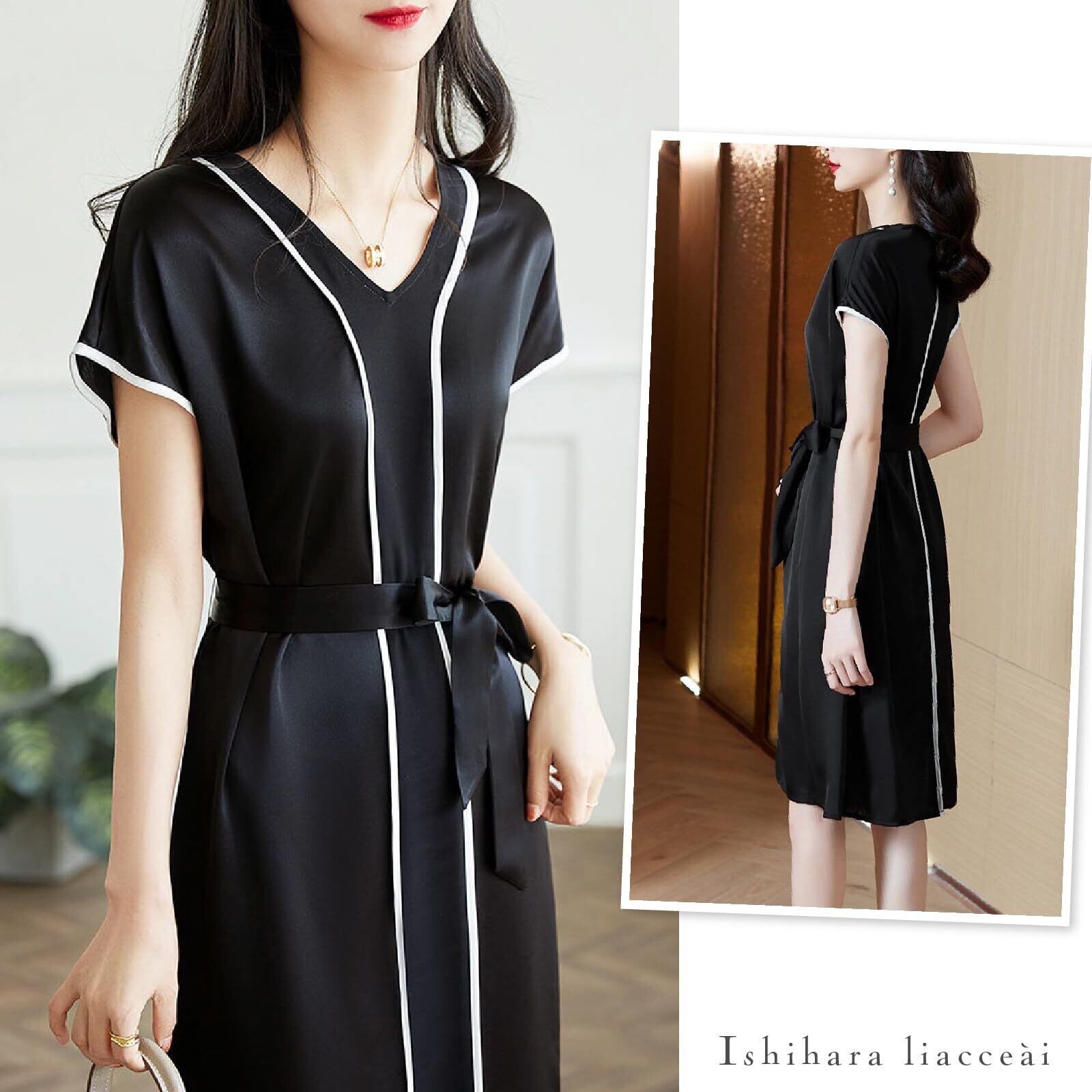 [Ishihara liacceai] ワンピース レディース ゆったり 半袖 きれいめ ロングワンピース パイピング 袖あり ひざ丈 ワンピ ドレス 春 夏 秋