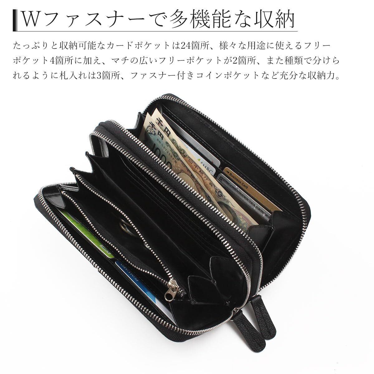 【牛本革×ヘビ皮の洗練されたコンビ】 牛本革にセンターラインの蛇皮インレイを施したラウンドファスナーの長財布。 蛇皮ラインは高級感あるアクセントとなり大人な雰囲気を醸し出しています。 【Wファスナーで多機能な収納】 たっぷりと収納可能なカードポケットは24箇所、様々な用途に使えるフリーポケット4箇所に加え、マチの広いフリーポケットが2箇所、また種類で分けられるように札入れは3箇所、ファスナー付きコインポケットなど充分な収納力。