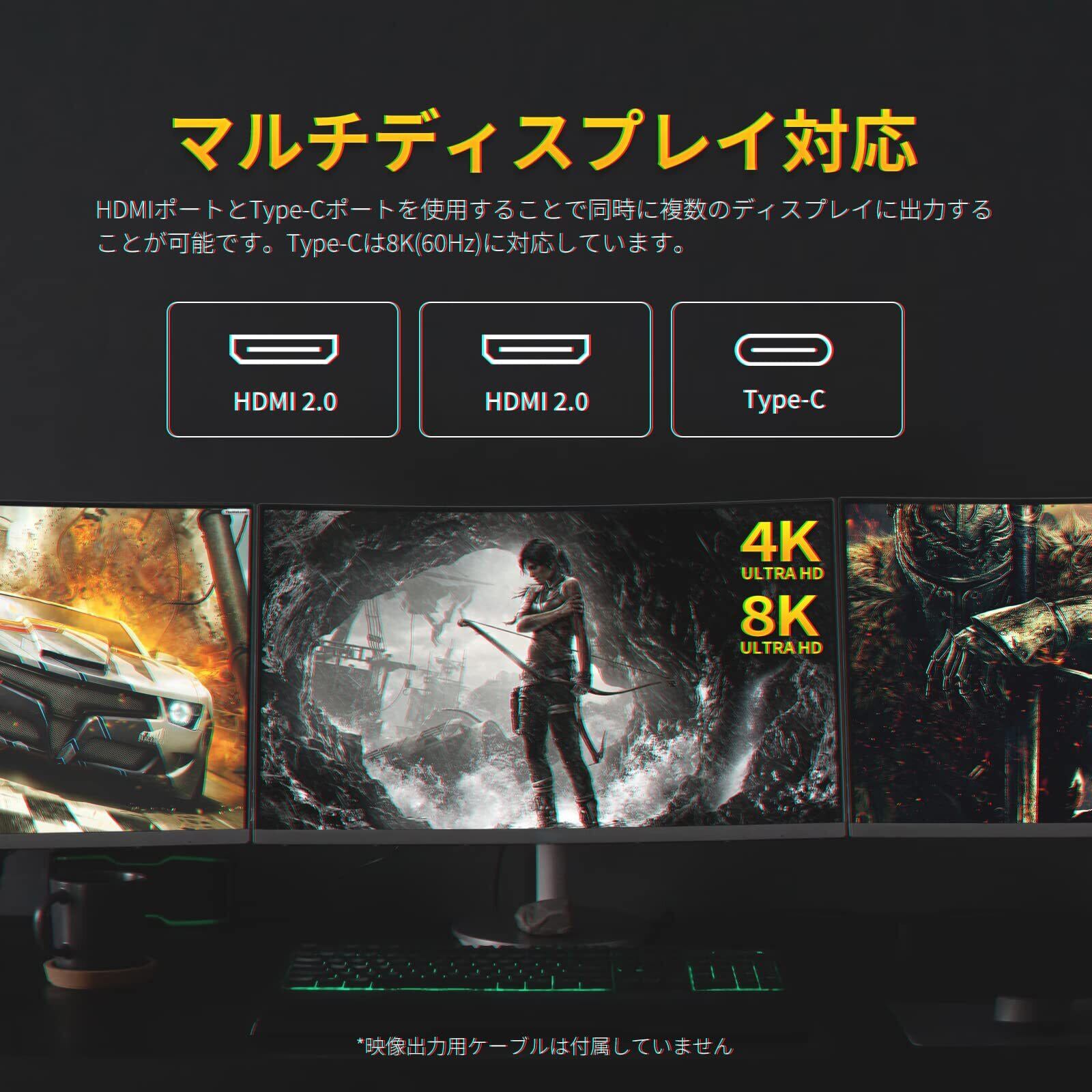 【4K/8Kマルチディスプレイ対応】同時に複数のディスプレイに映像出力が可能です。Type-Cは8K(60Hz)出力が可能です。