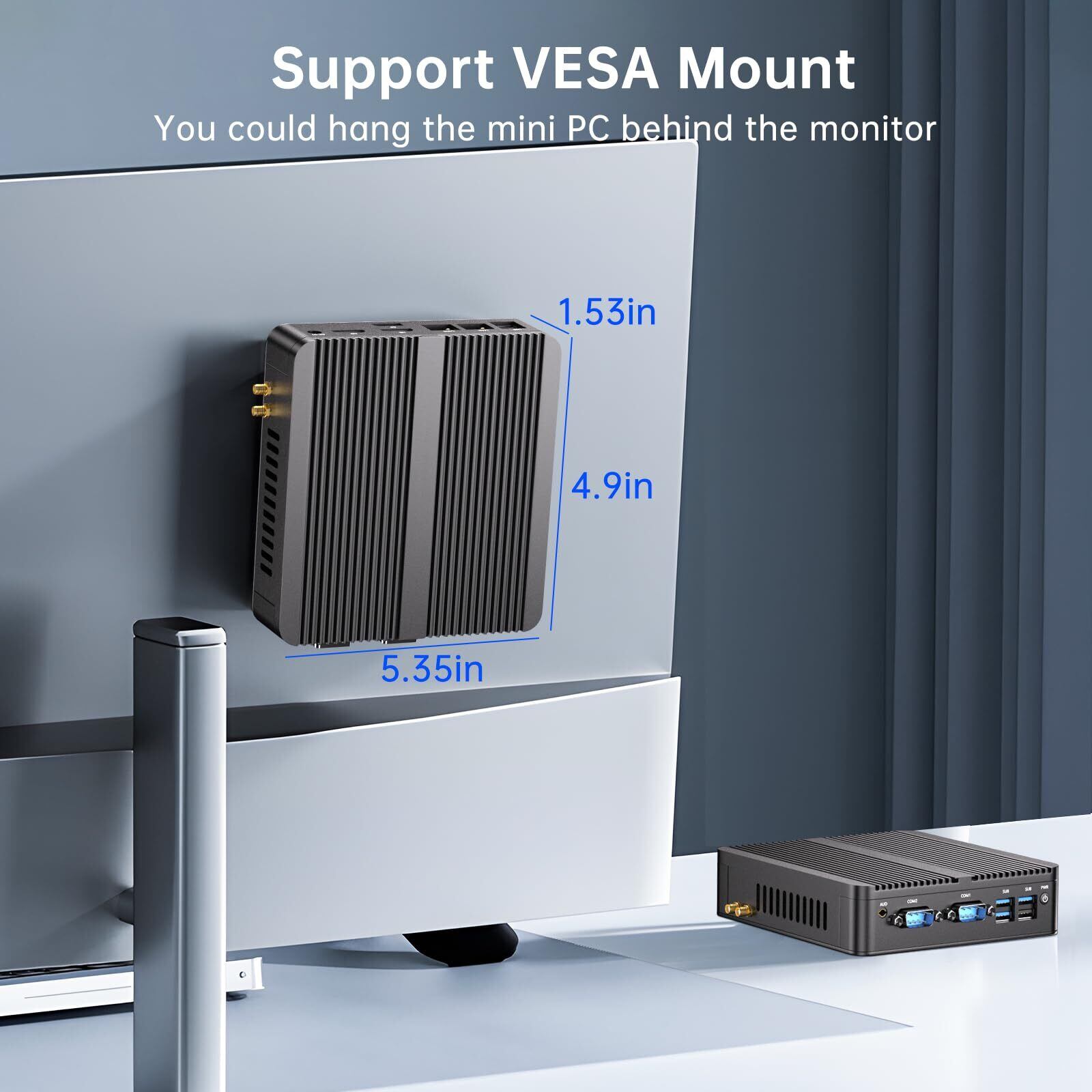 コンパクトでファンレスなデザイン: 製品のサイズは 137 x 126 x 48 mm で、非常に小さく、デスクトップ上であまり場所を取りません。このミニ コンピューターは、ファンレスの金属製ケース デザインを採用しています。金属製のケースは、コンピューターの熱を効率的に放散するのに役立ちます。電気代を節約し、ノイズを排除します。最も重要なことは、ほこりがマシン内部に入るのを防ぎ、コンピューターの寿命を延ばすことです。