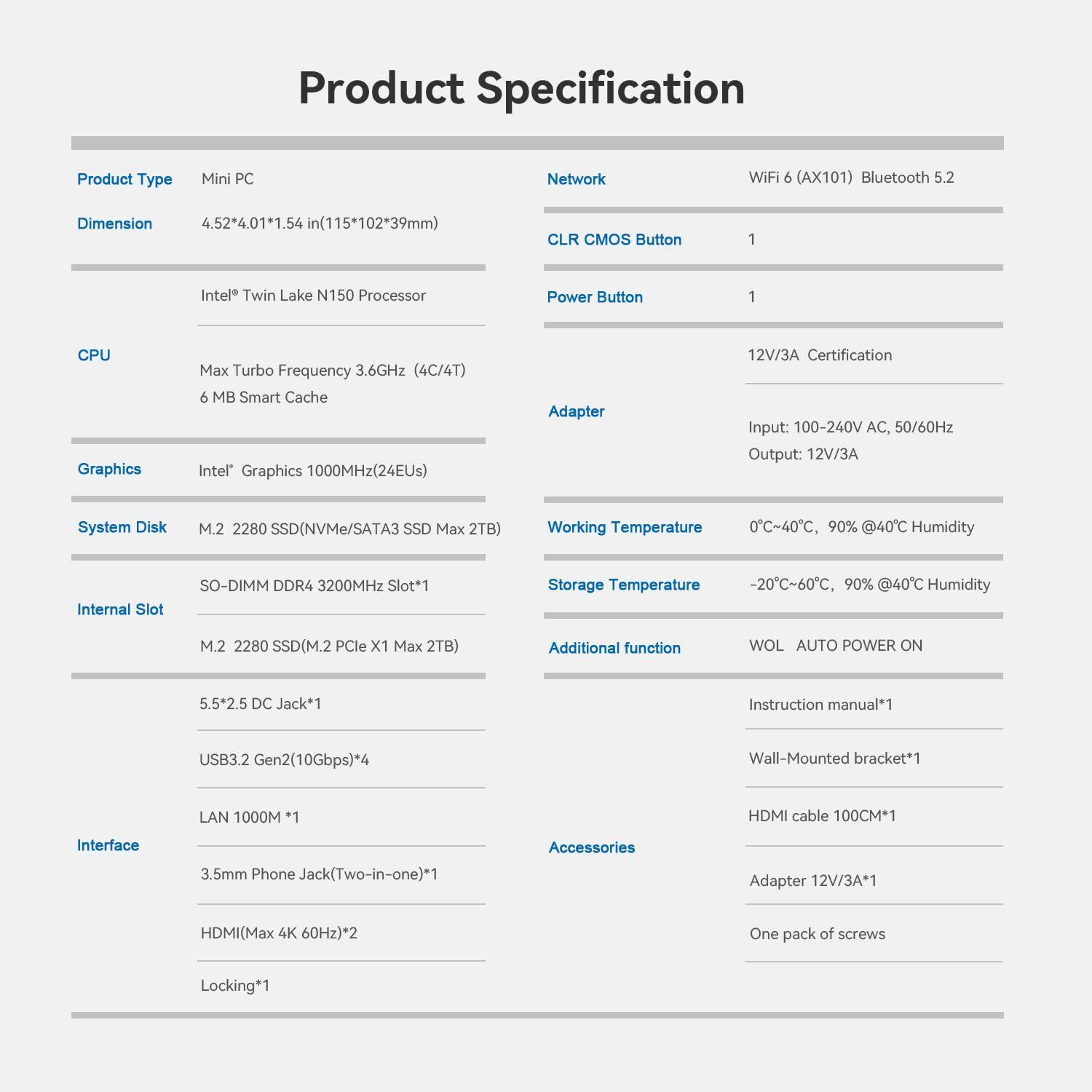 【16GB DDR4 RAMと500GB SSD】MINI S13ミニコンピューターは、16GBのメモリ容量と最大3200MHzのシングルチャネルDDR4速度を備えており、瞬く間にコマンドを完了できます。ストレージに関しては、日常や仕事のニーズを満たすために500GBの容量を備えています。さらに、MINI S13 N150は、2つのM.2 PCIe3.0スロットを介してM.2 SATA3 / NVMe SSDを置き換えることができ、最大2TBをサポートします。