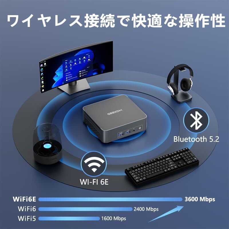 【WiFi 6E/ Bluetooth 5.2/Windows 11 Pro】GEEKOM BIZ X13はWiFi-6E ワイヤレスを備え、2.5G/5G/6G トリプルバンドを備え、高速で安定した無線接続を実現します。オンライン会議、動画視聴、オンラインゲームなど、様々なシーンで快適な接続環境を提供します。このミニPCにはすでにWindows 11 Pro がプリインストールされており、Windows 10 Pro、Linux など OS の変更をサポートします。