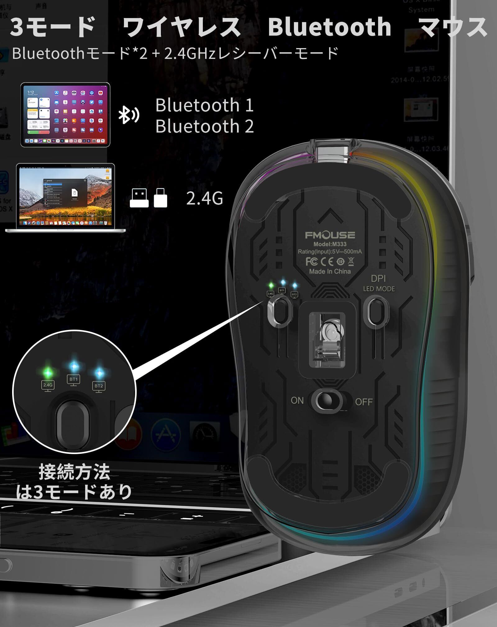 『マウス2.4G & Bluetooth *2マウス』マウス Bluetoothワイヤレスマウス 3モード 静音マウス 無線 Type-C充電式 2.4GHz光学式 3ボタン 4DPIモード 7色ライト付き 省エネルギー 高精度 小型 持ち運び便利 iPhone/iPad/Mac/Windows/Surface/Microsoft対応 日本語取扱説明書付き(Black)