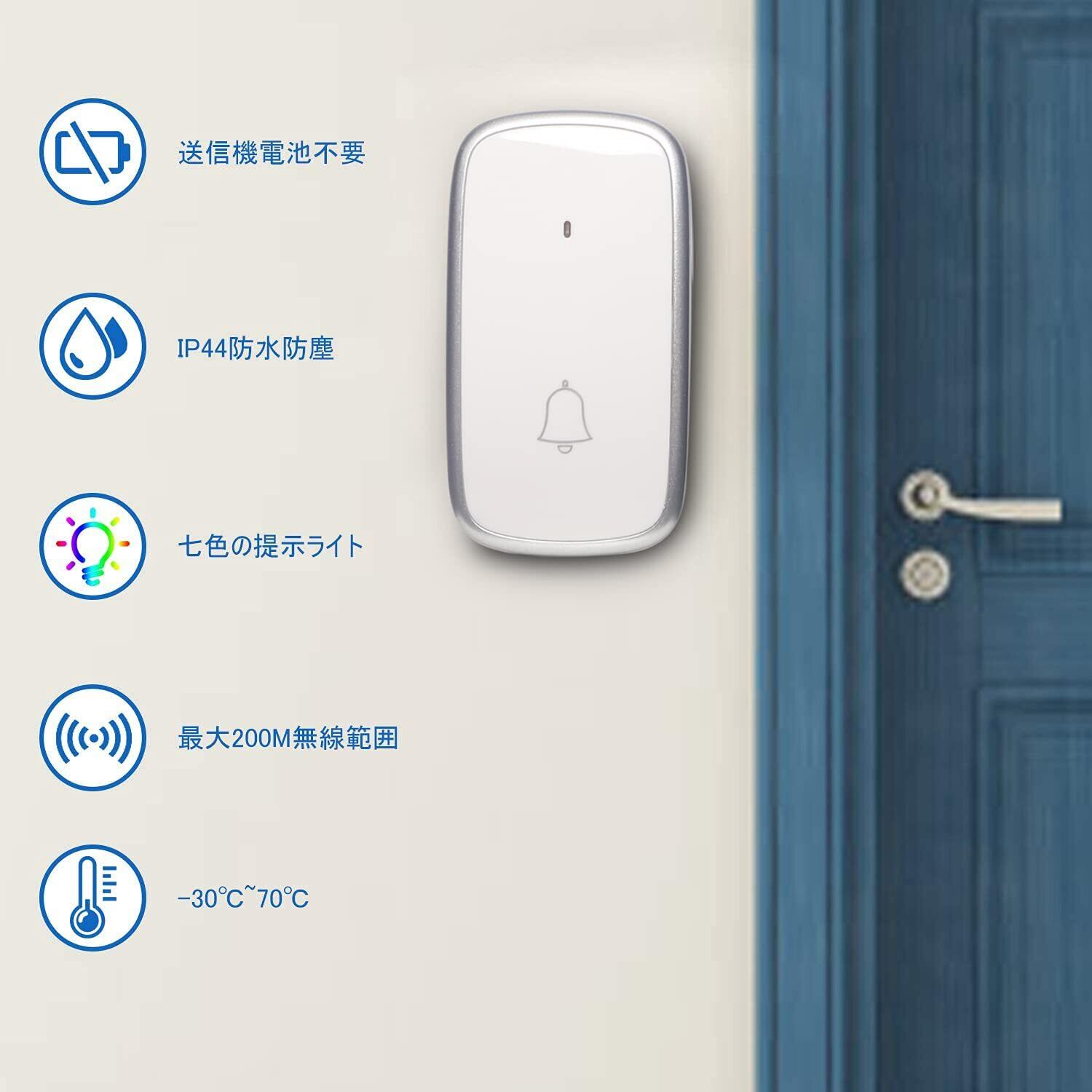 【7色の光と&5段階音量調整】玄関チャイムの発信機を押せば、呼出し音が鳴ると同時に、7色のLEDランプが点滅してお知らせします。老人か耳の不自由の方に大変便利です。光と音でお知らせ、お互いに便利なワイヤレスチャイム、緊急の時もすぐに気づけて安心できます。0db-125dbまで音量を5段階に調整できます。消音の設定ができます。