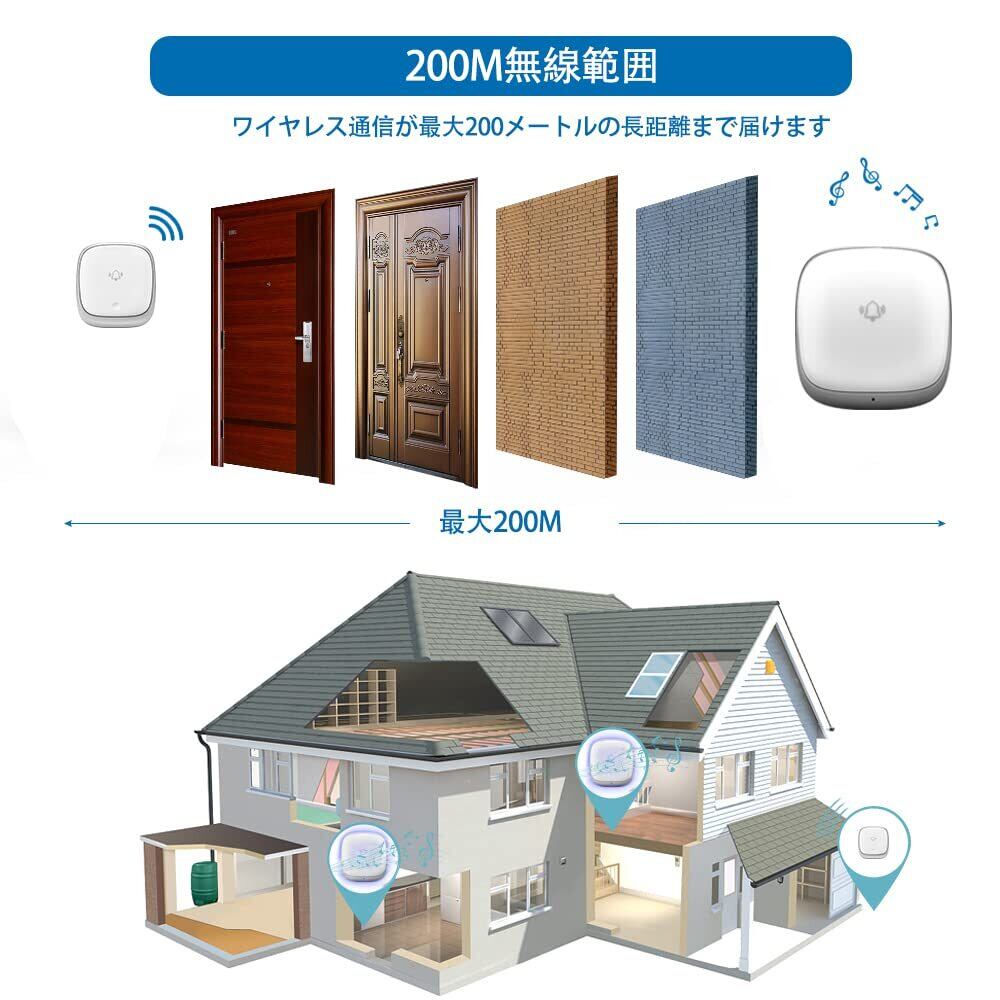 【200m無線範囲&38曲選択可能の音で呼び出し】このドアベル呼び出しセットは高感度の受信機を採用して、壁、木ドアー、鋼ドアーなどに安定受信でき、2階建ての建物でもご使用いただけます。障害のない場所でワイヤレス通信が最大200メートルの長距離まで届けます。広い家でも安心できます。メロディーを38曲から選択できます。また、受信機は送信機によって違う音を設定できます。フロントドアまたはバックドアどっちらからの送信が分かりやすくになります。