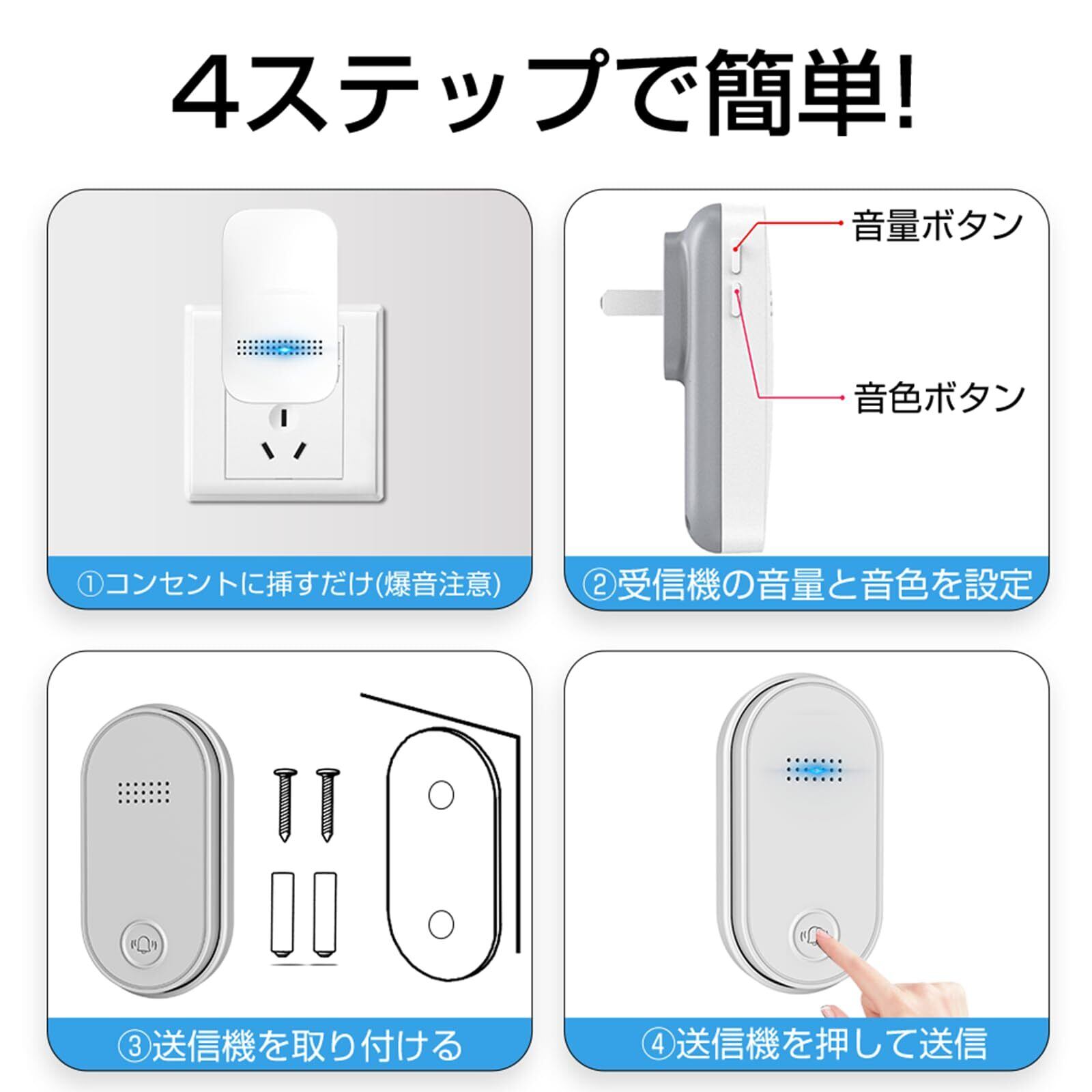 【38曲4段階音量調節可能のワイヤレスチャイム】このチャイムの発信機を押すと、受信機が音を立てながら青いライトが点滅してお知らせします。さらに38種類の曲と0-100DBの4段音量を調整することができます。使用したい場所やお好みに合わせてご使用ください。