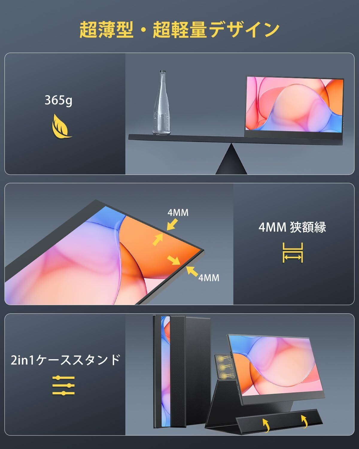 【スタイリッシュで快適な外観・持ち運び】EVICIVモバイルモニターは超薄ベゼルを備え、画面の視認領域を最大限に拡大しています。フルブラックのアルミ合金外装は、ディスプレイに高品質でスタイリッシュな印象を与え、高い硬度と効率的な放熱性を備え、全体的なパフォーマンスの安定性を向上させます。スピーカーを底部に配置することで、よりバランスの取れた立体的な音響効果を生み出し、ユーザーにより没入感のあるオーディオ体験を提供します。バックパックやスーツケースに簡単に収納でき、移動中の仕事やエンターテイメントを便利に楽しむことができます。ご注意:①接続の端末がDPALT MODEに対応しない場合はType-Cケーブルで接続できないです。詳しくは商品画面の【対応機種一覧表】をご参考ください。②電圧を安定させ、コントラスト、輝度、音量を上げるために、付属のケーブルや電源アダプターを使用して電力を供給してください。