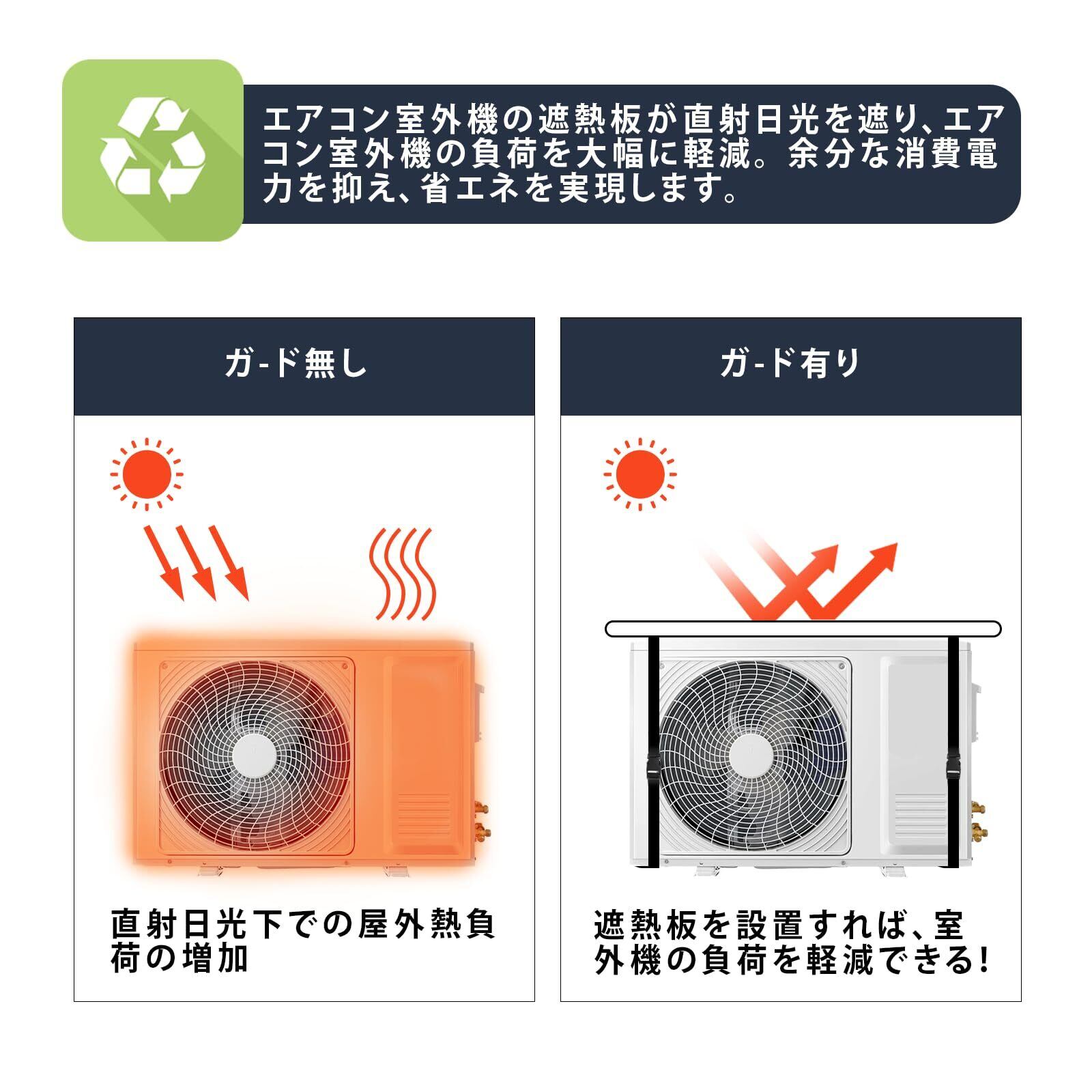 【省電力と省エネ】 エアコン室外機遮熱シートは直射日光を遮り、エアコン室外機の負荷を大幅に軽減することができます。 余分な消費電力を抑えて省エネを実現します。