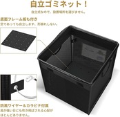 【商品仕様】カラー:ブラック、折りたたみ時の厚み:約2cm、重量:約1.5kg、材質:ポリエステル、ポリ塩化ビニル。【セット内容】ゴミネットx1、防風ワイヤーx1、カラビナx1、底面フレーム板x1、日本語説明書x1※45Lのゴミ袋2個が収納目安になります。