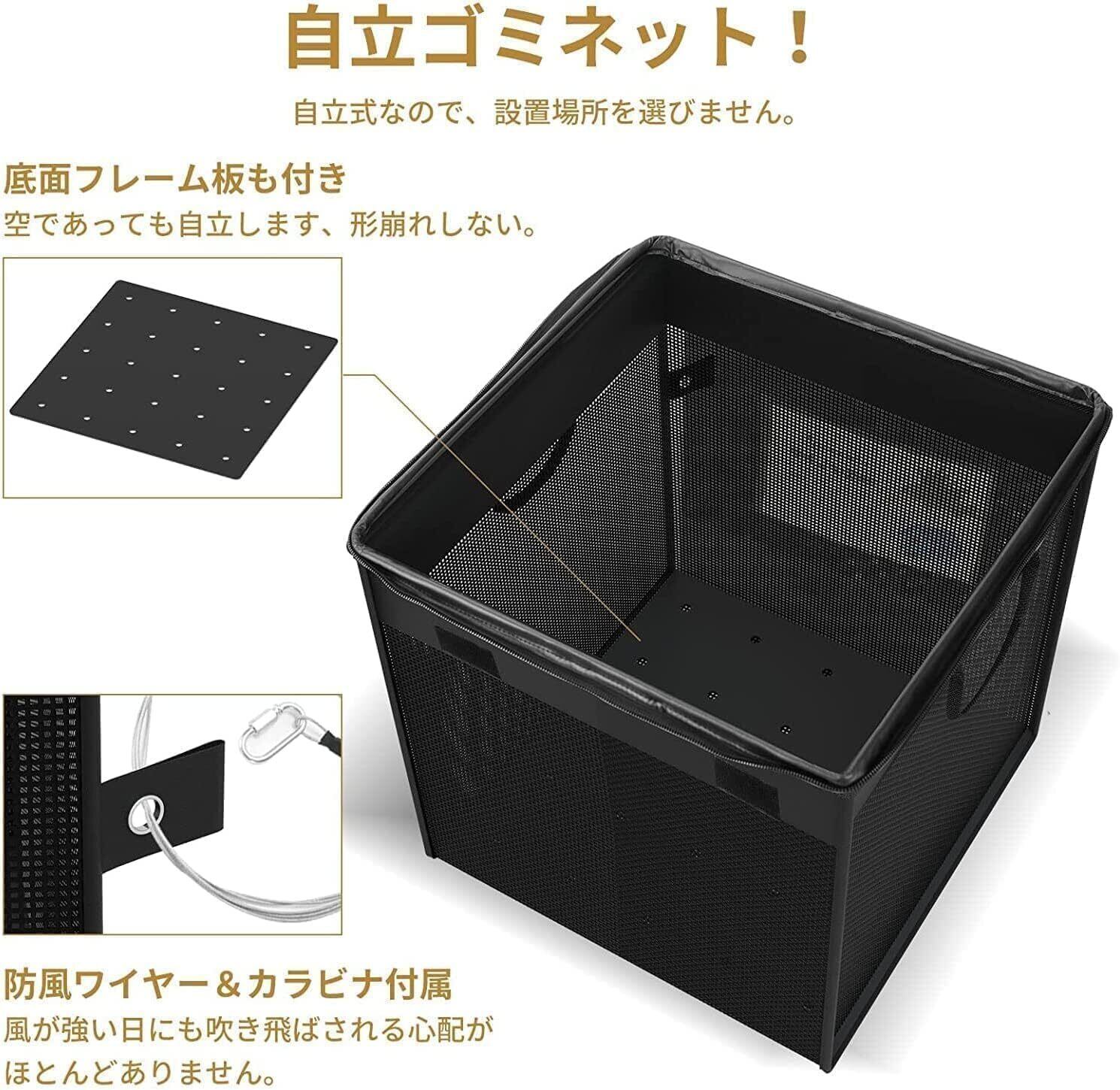 【自立式・固定ワイヤーロープとカラビナ付き】自立式なので、設置場所を選びません。底面フレーム板も付き、空であっても自立します、形崩れしない。 固定ワイヤーロープとカラビナがついているので、ハトメを通して固定されば暴風などで飛ばされるのも防ぎます。ベランダや玄関先でのごみの散乱を防ぎます!