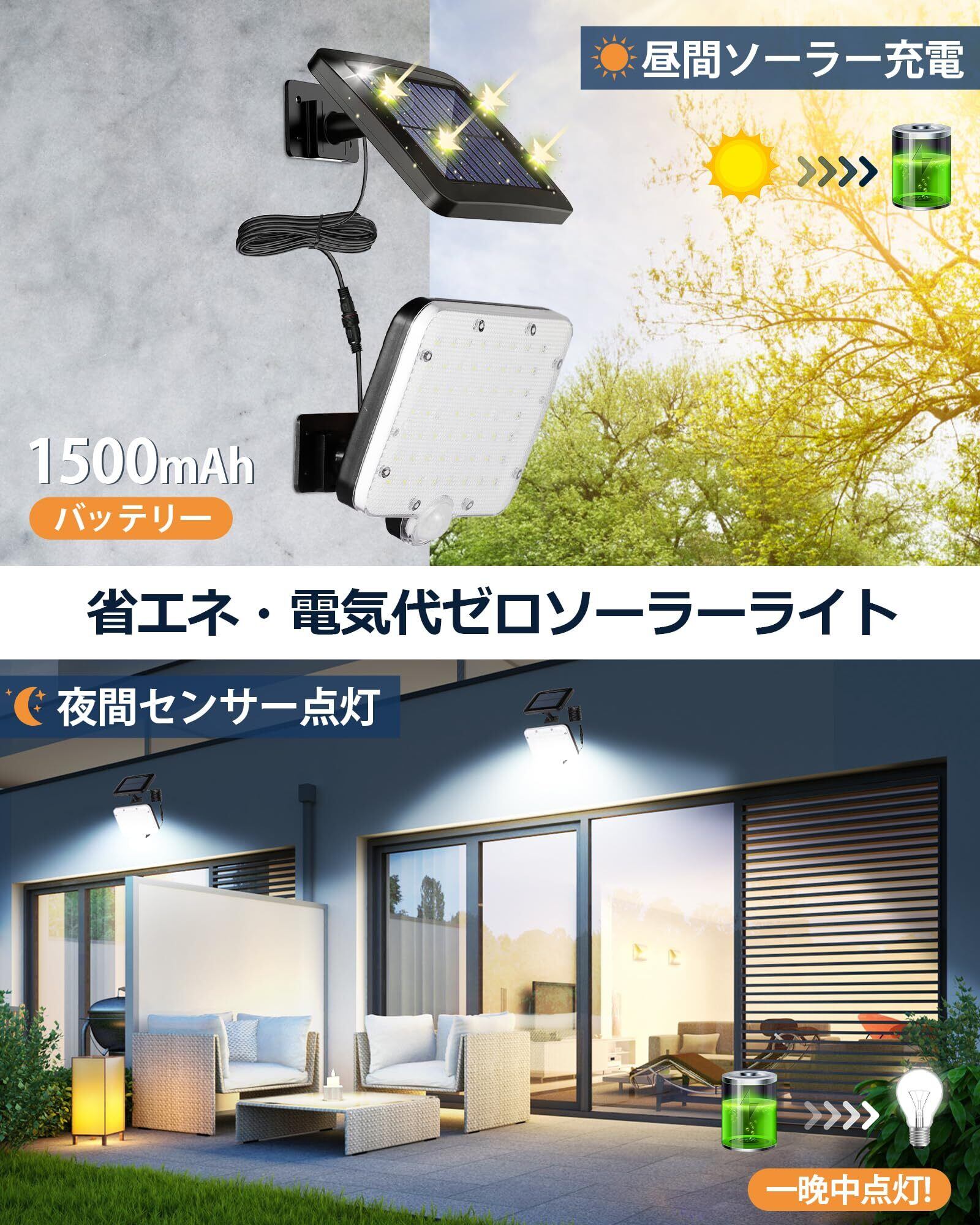 【ソーラー給電で省エネ・1500mAh容量】完全ソーラー充電式なので、電気代はゼロです。防災や停電に大活躍。ソーラーパネルに明暗センサーがありますので、光を感じされるとライト自動電源切れます。夜に入ると、ライトが自動的に作動します。1500mAh容量は一面発光センサーライトとして十分です。作業時間は約10〜12時間です。