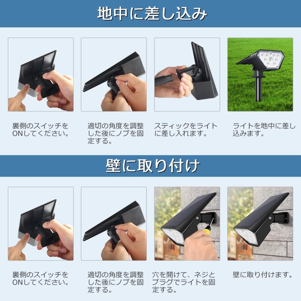 「設置自由」 一体型なデザインにより、配線が一切不要です。ヘット部分は90度まで回転できますので、適切な充電・照明角度が変えられます。スポットライトとウォールライト両方としても使用可能です。