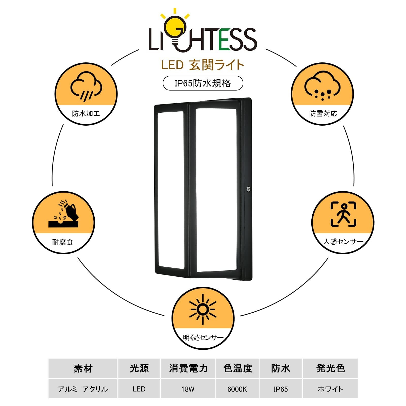 Lightess LED 玄関灯 玄関ライト 人感センサー ポーチライト ブラケットライト 防水 防雨型 IP65 壁掛け照明 照明器具 ウォールライト 屋外 門柱灯 勝手口 ウォールランプ 外灯 門灯 玄関照明 防犯ライト 駐車場灯 廊下灯 街灯 庭園灯 ガーデンライト 18W (ホワイト)