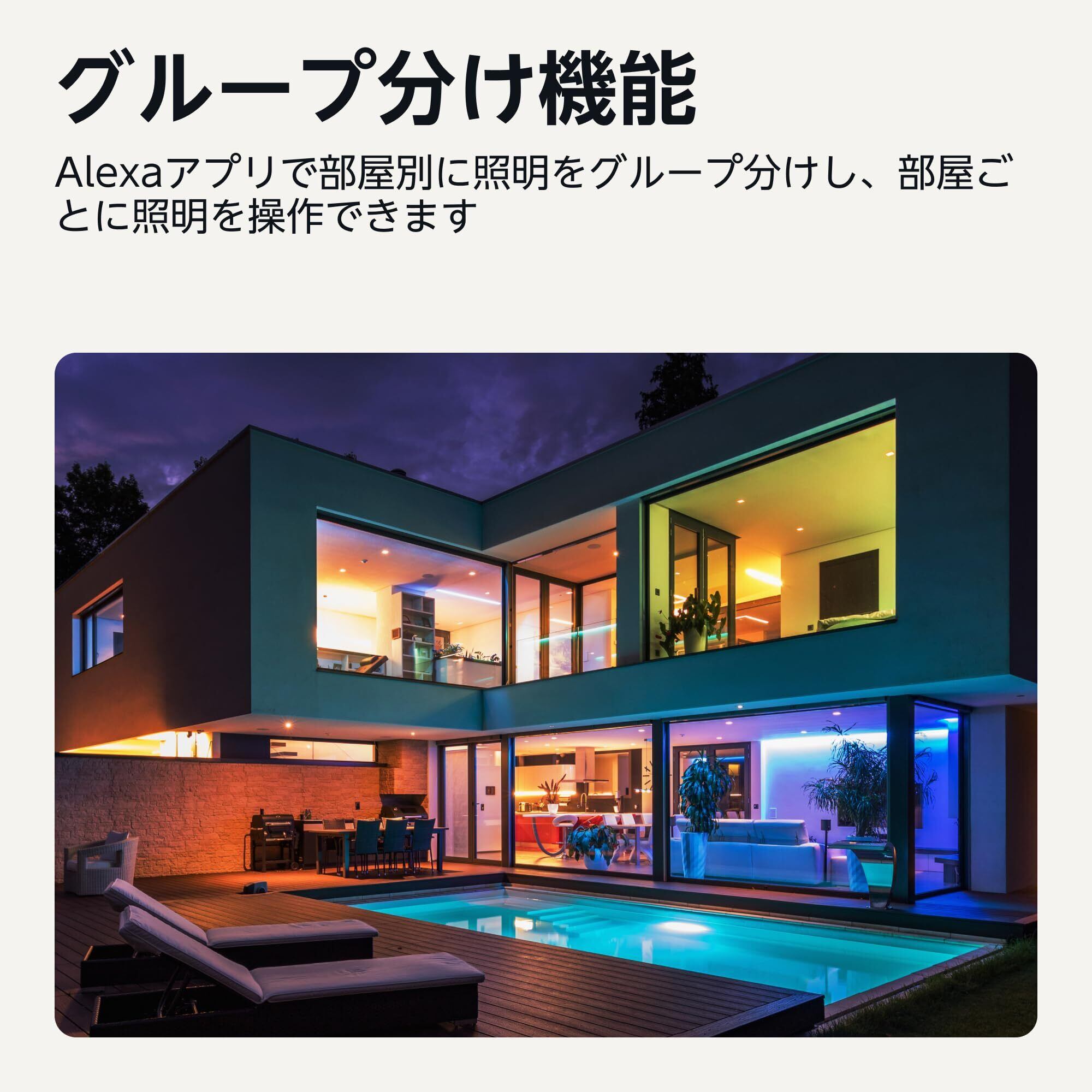 【グループ制御】 Alexaアプリでグループを作成して照明を組み合わせると、音声コマンド/アプリ一回の使用で、部屋ごとの照明・家のすべての照明を制御できます。寝る時間になったら、”アレクサ、寝室の電気を消して”と話しかけて電源をオフにすることも、Alexaアプリで寝室の照明を一気に消すこともできます。