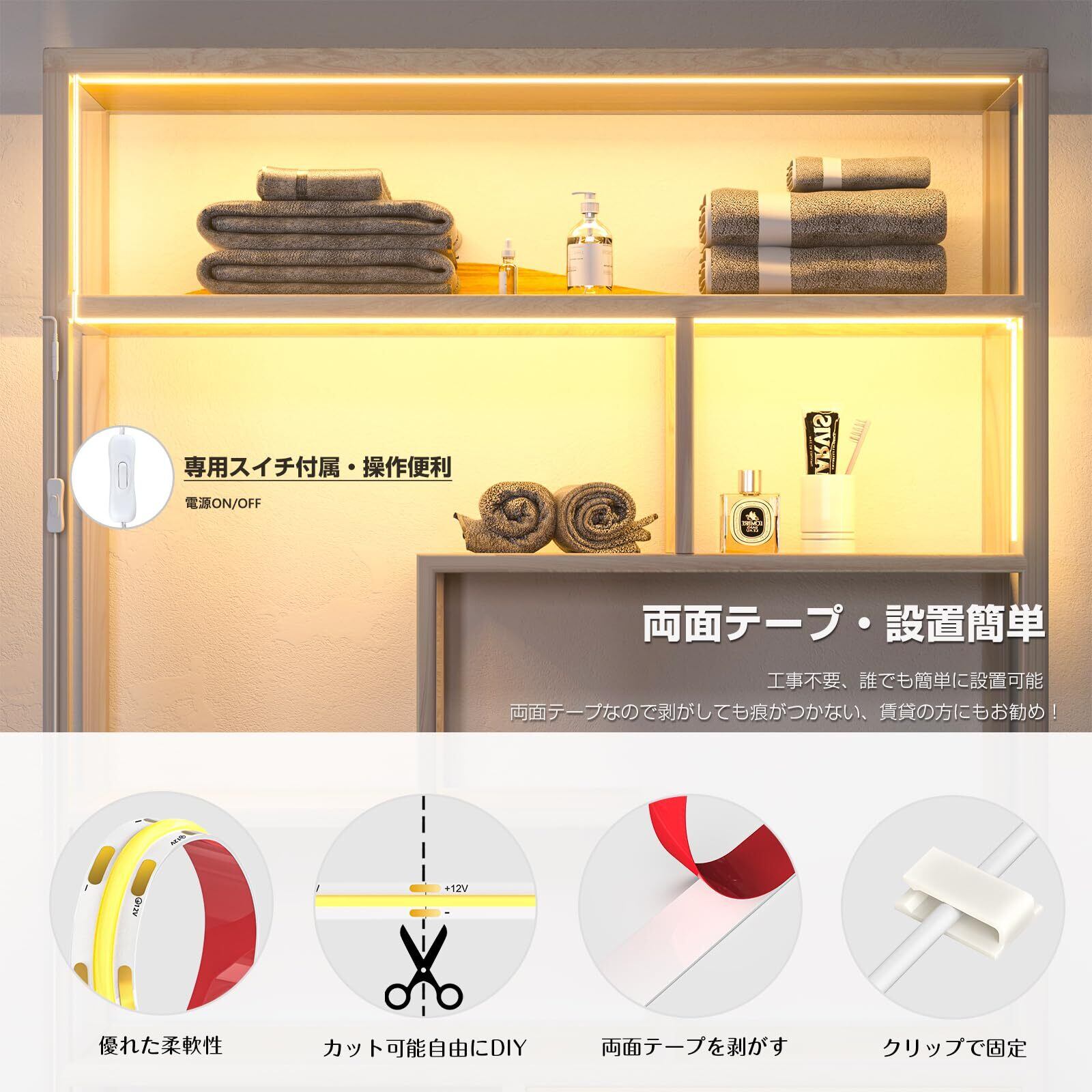 【長寿命&省エネ・電気代を抑える】2mのCOB LEDテープライトの消費電力12W、電気代をできるだけ抑えて楽しみたい人にもぴったりです。洗面所の鏡の周囲やキッチンの壁、ベッドの下など、長期間つけておきたい場所の間接照明としても役立ちます。
