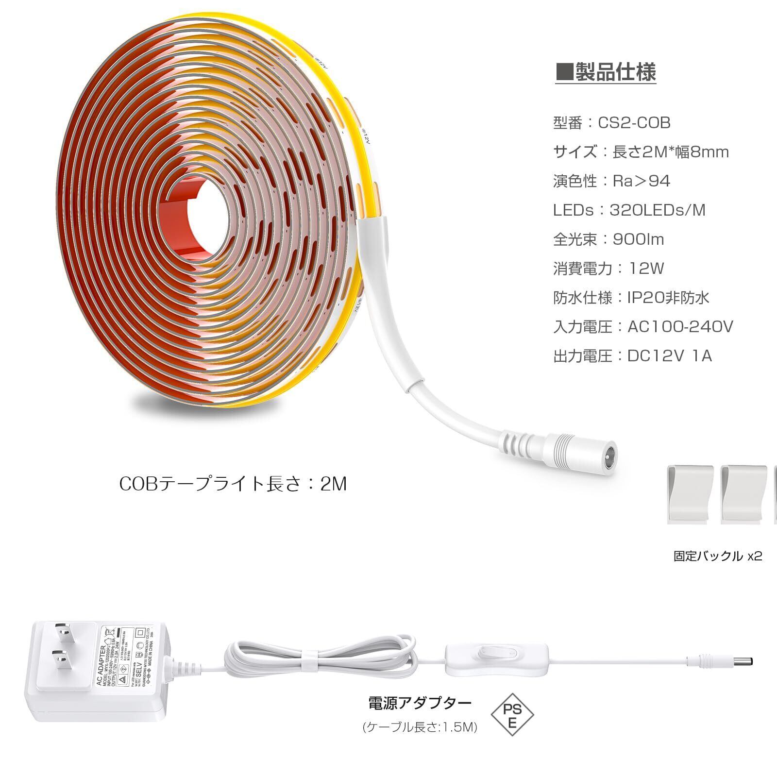 【パッケージ内容】COB LEDテープライト、電源アダプター(ケーブル長さ1.5m)、固定バックル、日本語説明書