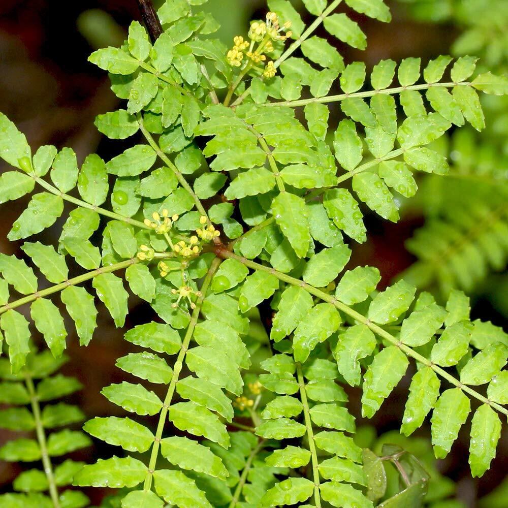 この山椒は雄株なので葉を利用します。葉の付け根の対称の位置に鋭い棘があり、葉は長さが5~15㎝位です。 小さな葉が奇数になり羽状の形をしていていて、5~13枚のギザギザの葉が対(つい)でついています。 葉には特有の柑橘に似た爽やかな香りがあります。