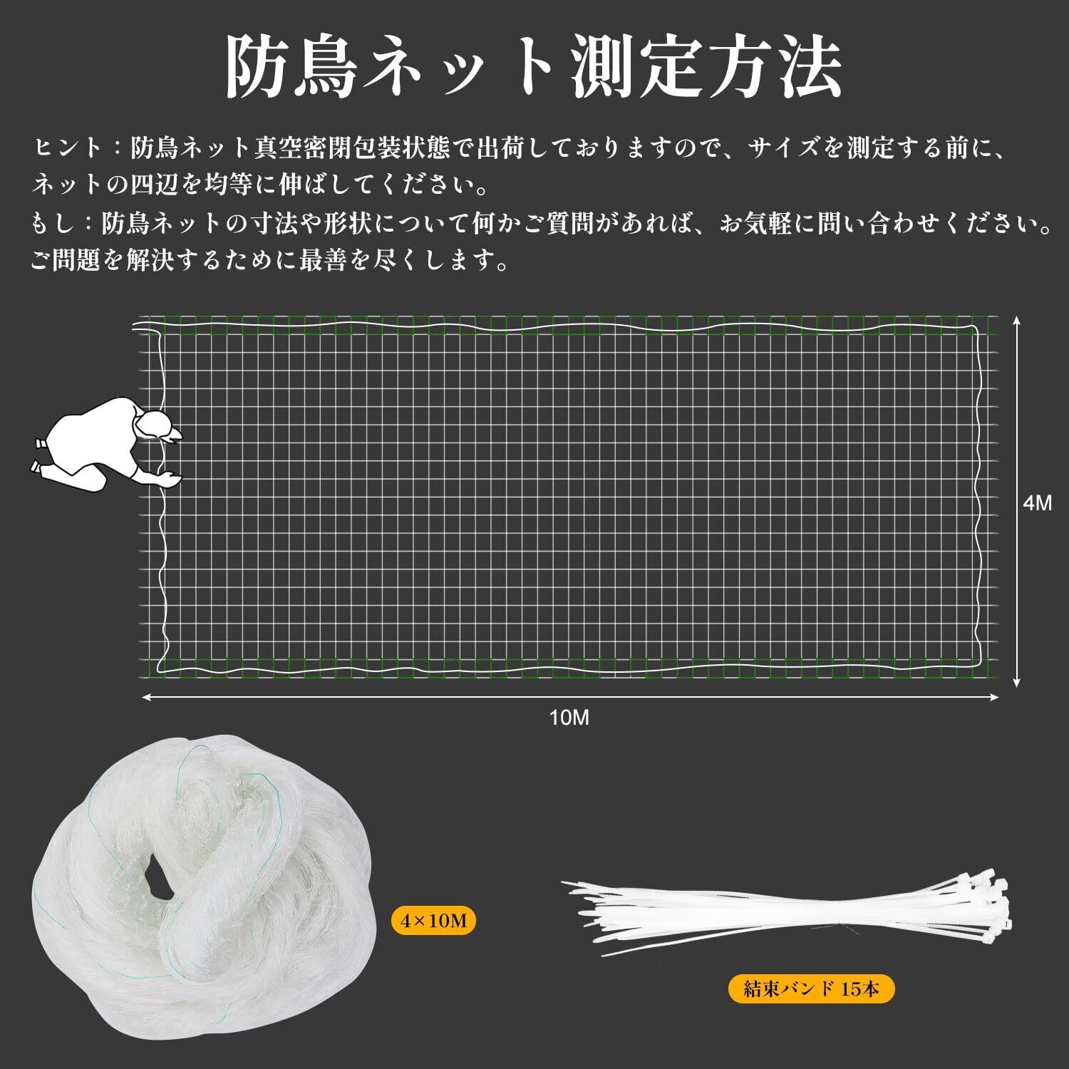 鳥よけネットの両端に緑の確認ラインが入っておりますので、目視ながら張れて、女性一人でも気軽に取り付けられます。商品サイズの測量方法:ネットを完全展開してから測量します。もし商品について何か問題があればいつでも弊店をご連絡を待ちしております。