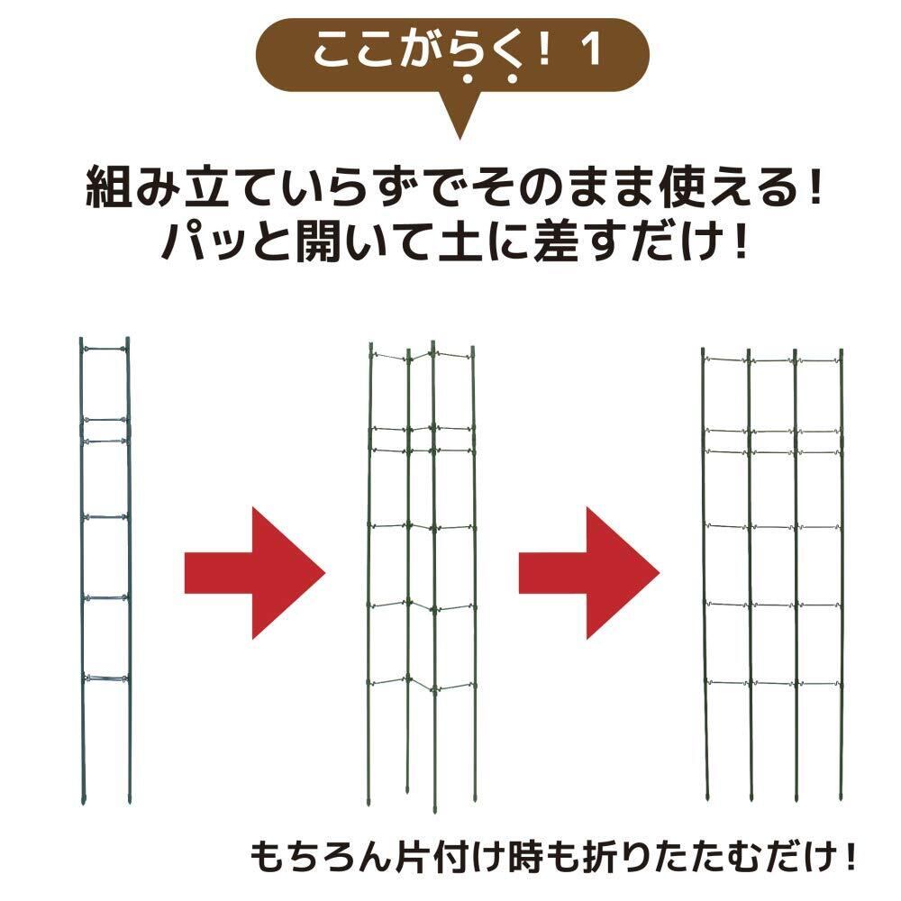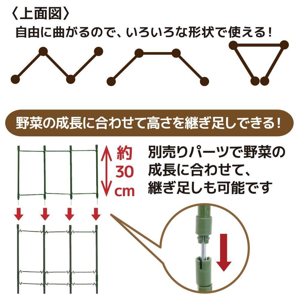 ・組み立て不要で、開いたらそのまま土にさして設置できます!組み立て・設置らくらく。 ・アーム部分が曲がるので、土への差し込みがカンタンです。先に両端だけ差し込んで、真ん中は後から差し込んでも設置できます。 ・タワー型やトレリス型などいろんな形状にアレンジして使用できます。 ・固定に便利なパッカーが付いています。 ・野菜の成長に合わせて継ぎ足しセット(※別売り)で高さを継ぎ足していくことができます。