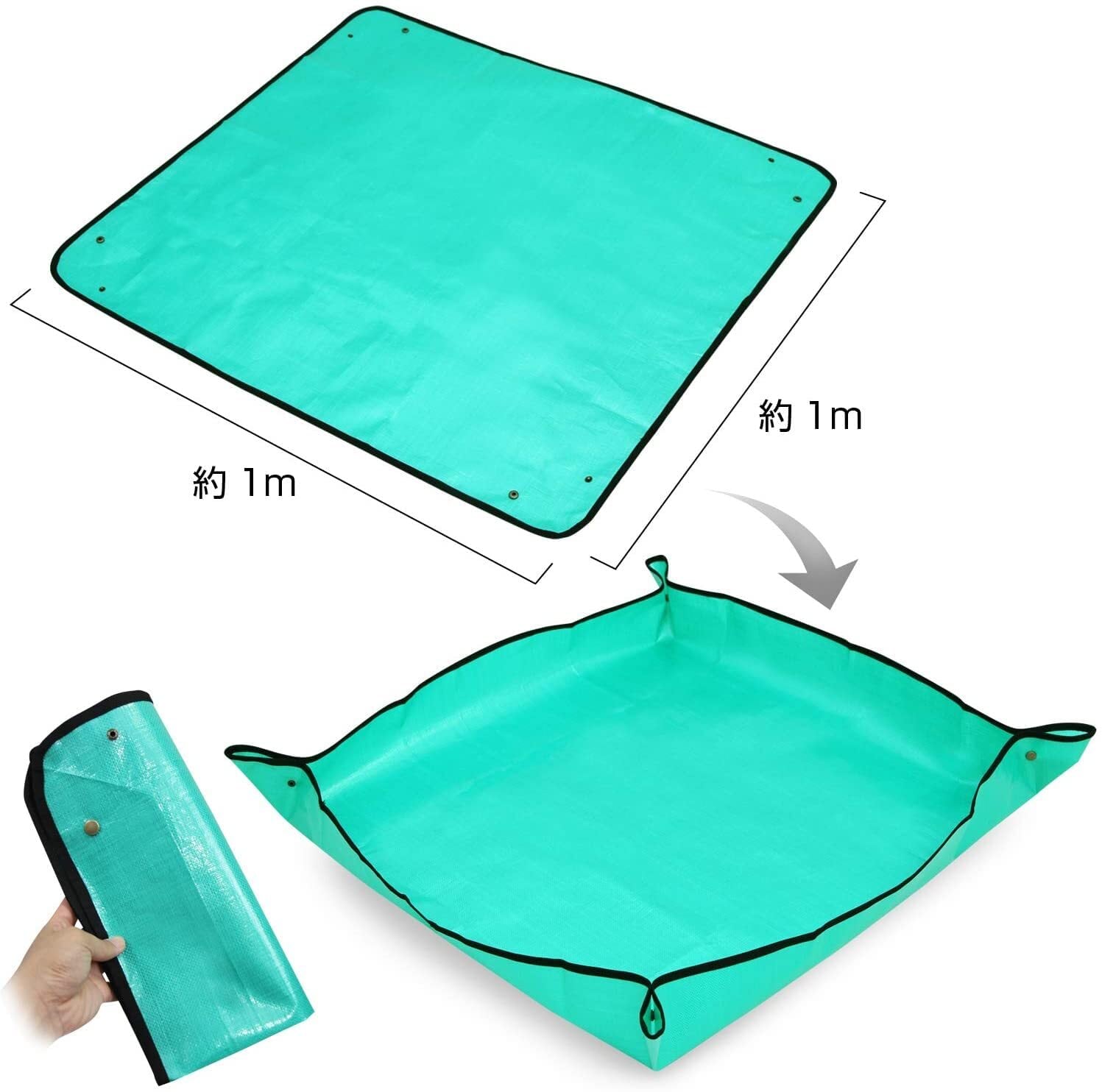 四隅のスナップボタンを留めることでトレイ状になり、用土のこぼれ落ちや、飛び散りを防止。地面を汚れることはしません。