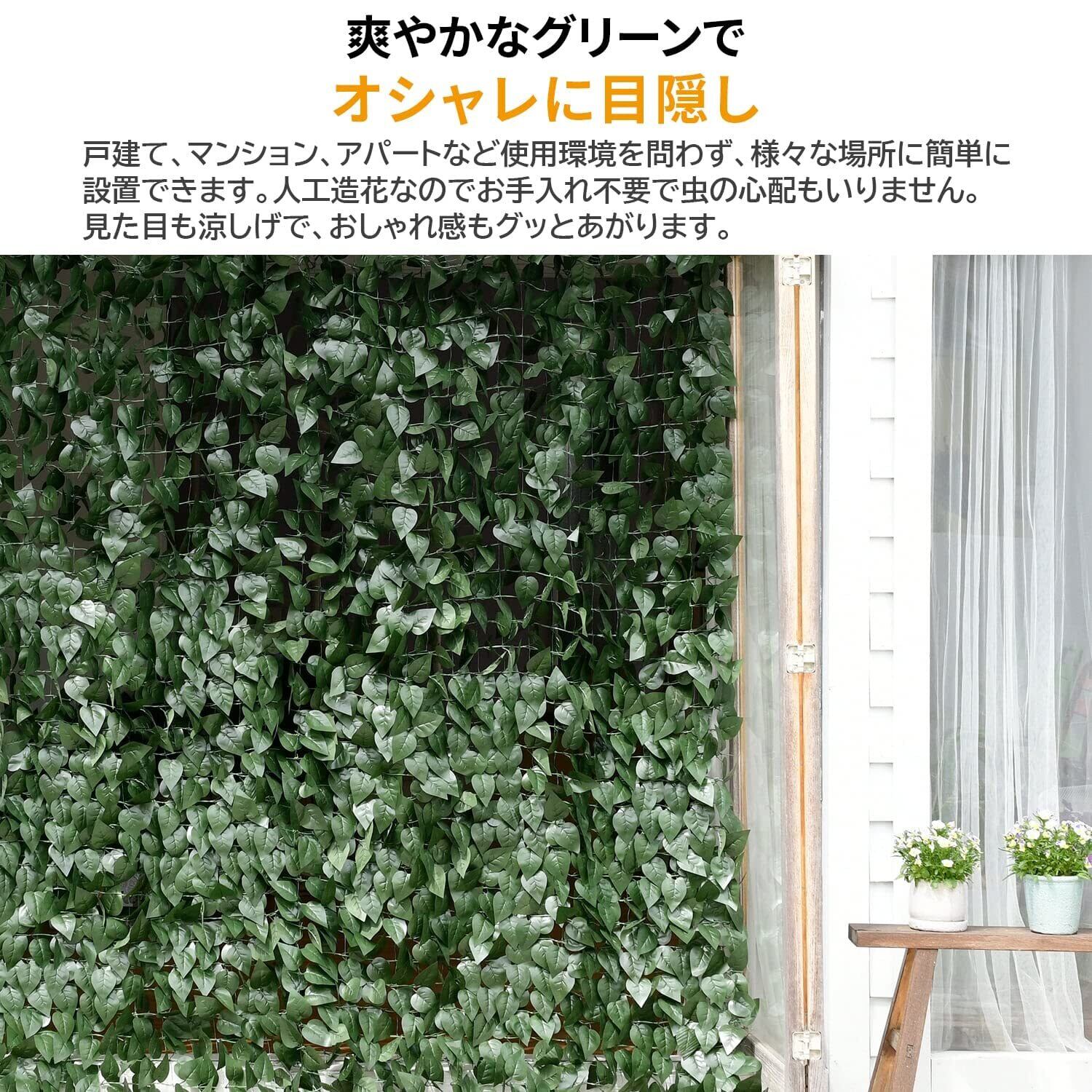 【特徴】目隠しが出来るフェイクグリーンです。従来よりもリーフが多く、バルコニーやフェンスなどの直線的な場所の目隠しに適したハードネットタイプで、型崩れなく、しっかりと取り付けることが可能です。自然なイメージで上品に目隠しが出来ます。フェイクリーフなので虫の心配がなく、育てる手間も不要です。