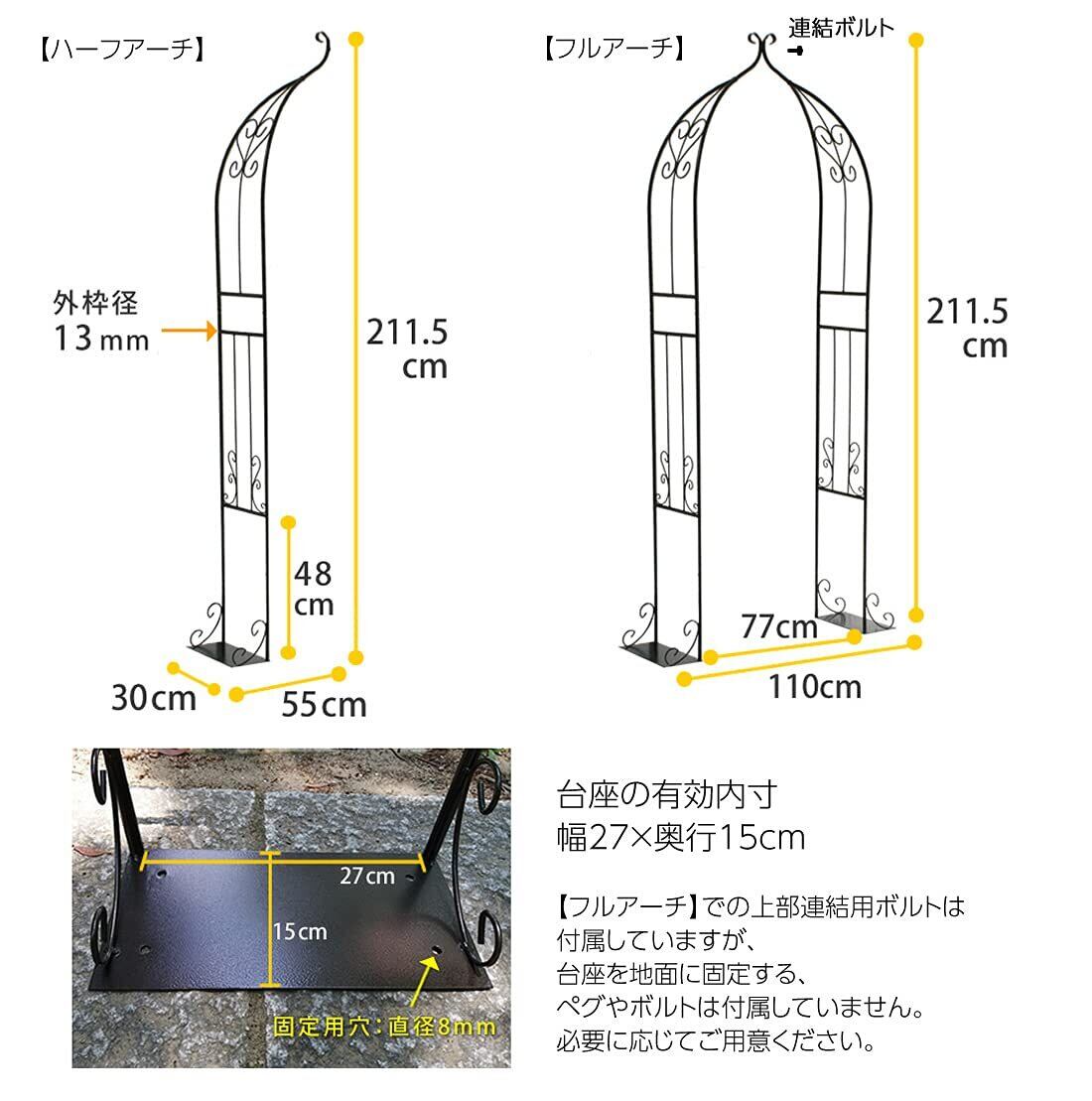 鉢置き台付きのハーフアーチタイプアイアンフェンスです。フルアーチは、ハーフ2面を合わせて固定する仕様です。幅30cmで置き場所に困らず、鉢が重石になりますので土以外の地面でも設置可能です。