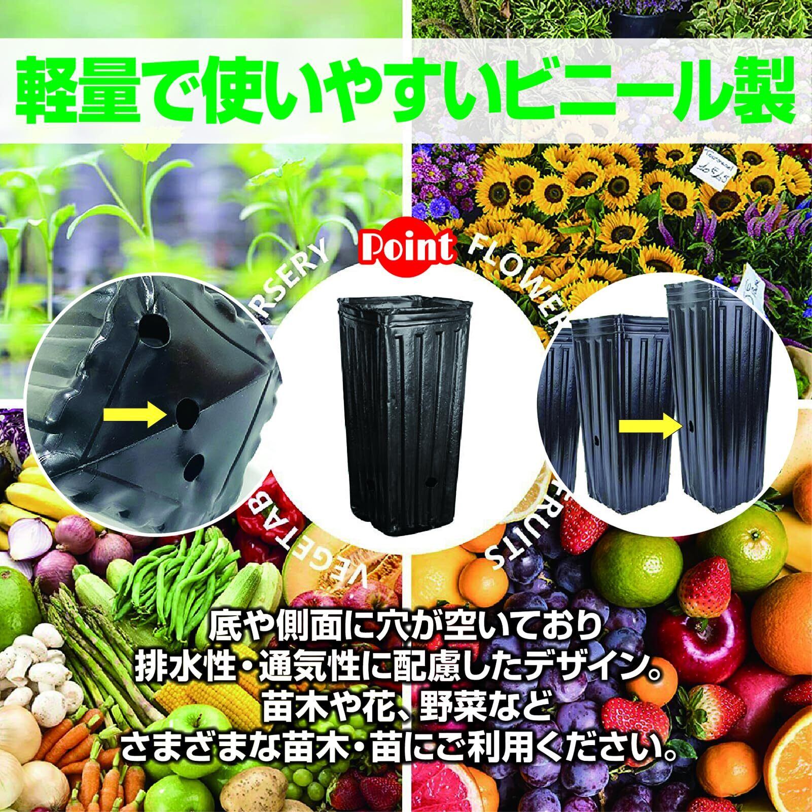 ロングタイプの苗木ポット、苗ポット、ポリポットを、50個ワンセットでお届けします。通常のポットよりも高さがあるため、根詰まりしづらいデザイン。ご家庭用から業務用まで、さまざまなシーンでご利用ください。