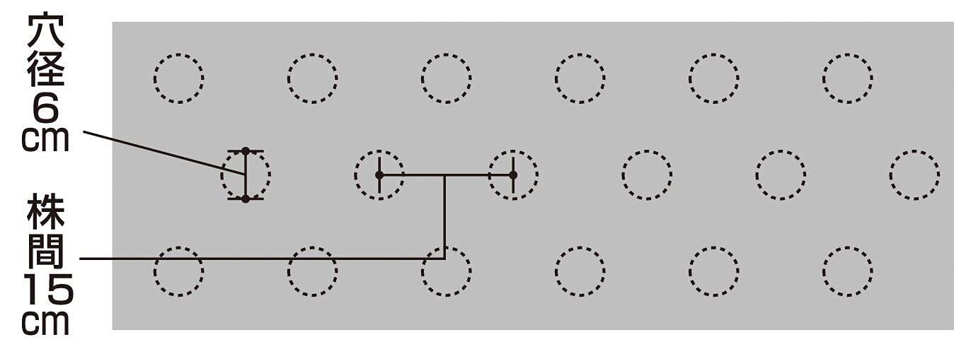 露地栽培の定番、黒マルチ。あらかじめミシン目の入った穴が用意してあるフリータイプマルチです。カッターが無くても、栽培する作物に合わせた位置に簡単に穴をあけて播種、定植する事ができます。あらかじめ15cm間隔で3列(9315チドリに相当)・直径45mmの穴が開けられるようにミシン目加工してあります。必要な場所のミシン目をむしって、穴をあけてご使用ください。