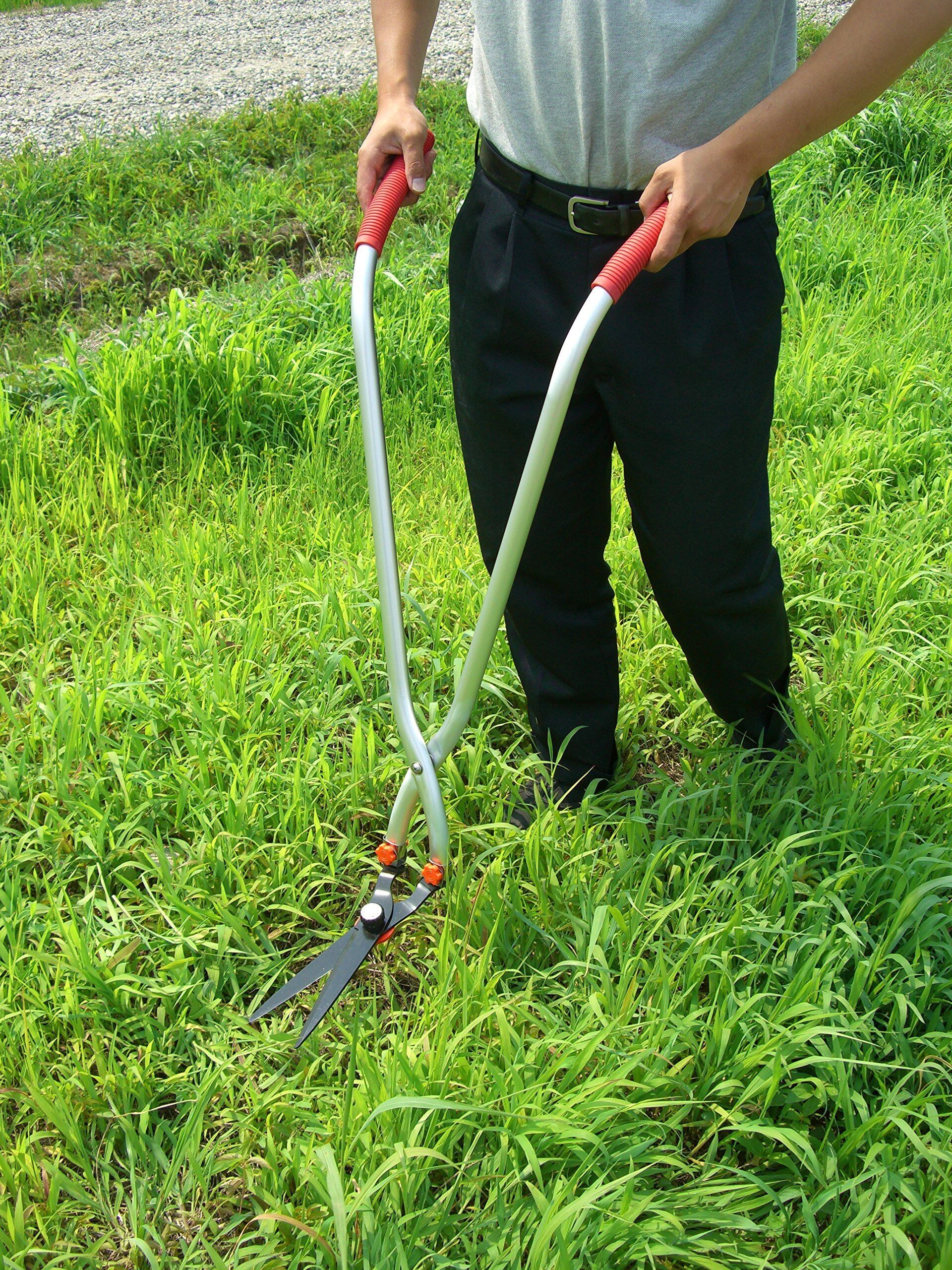 立ったまま草刈りが出来るので腰への負担が少なく、楽に作業が出来ます。アルミパイプ仕様なので軽量。ハサミの開閉を両手で行うので腕も疲れにくく、女性やご年配の方でも簡単に扱うことができます。安心の日本製。