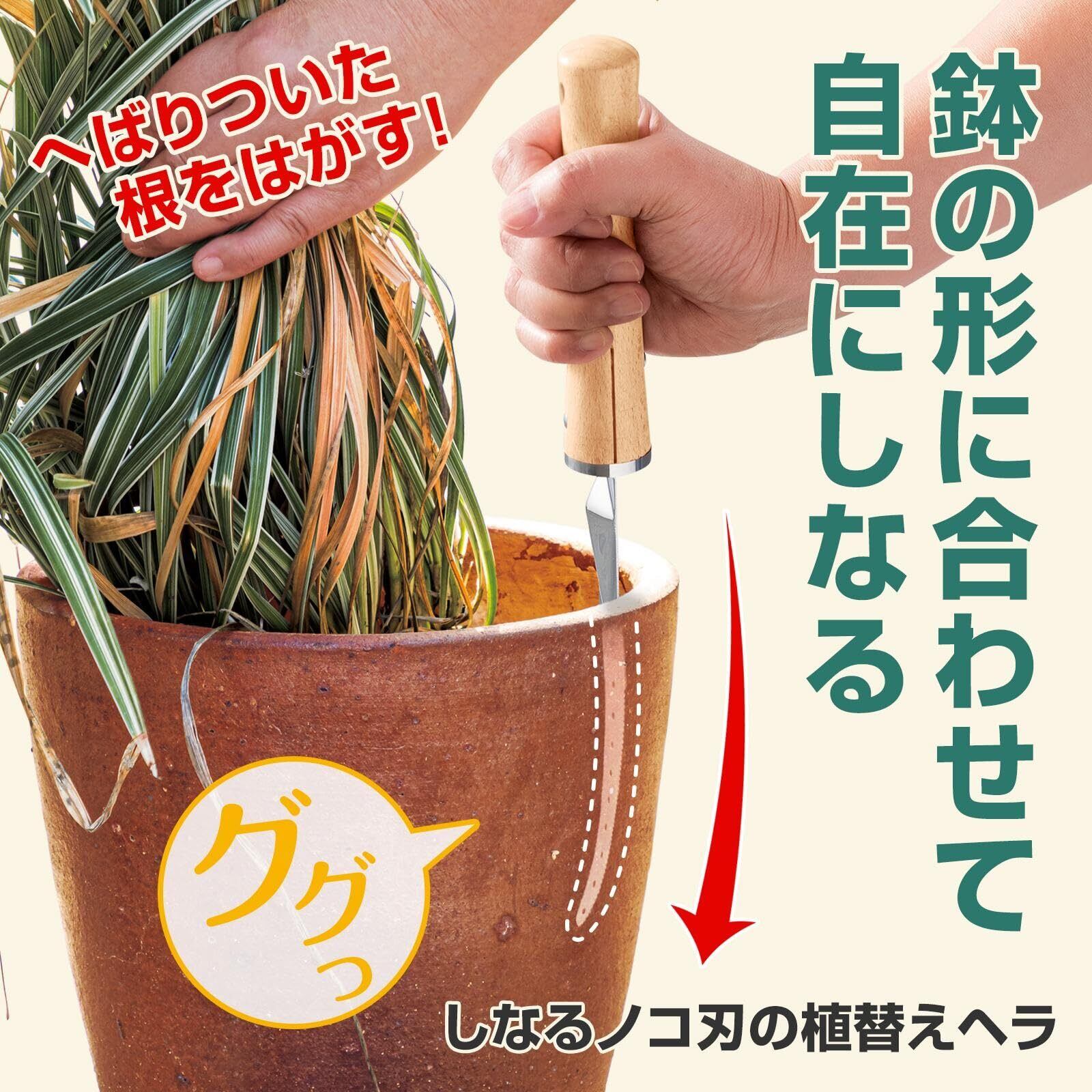 刃がしなって鉢の縁にピッタリ沿うので、土や根を丸ごとごっそり取り出せる。
