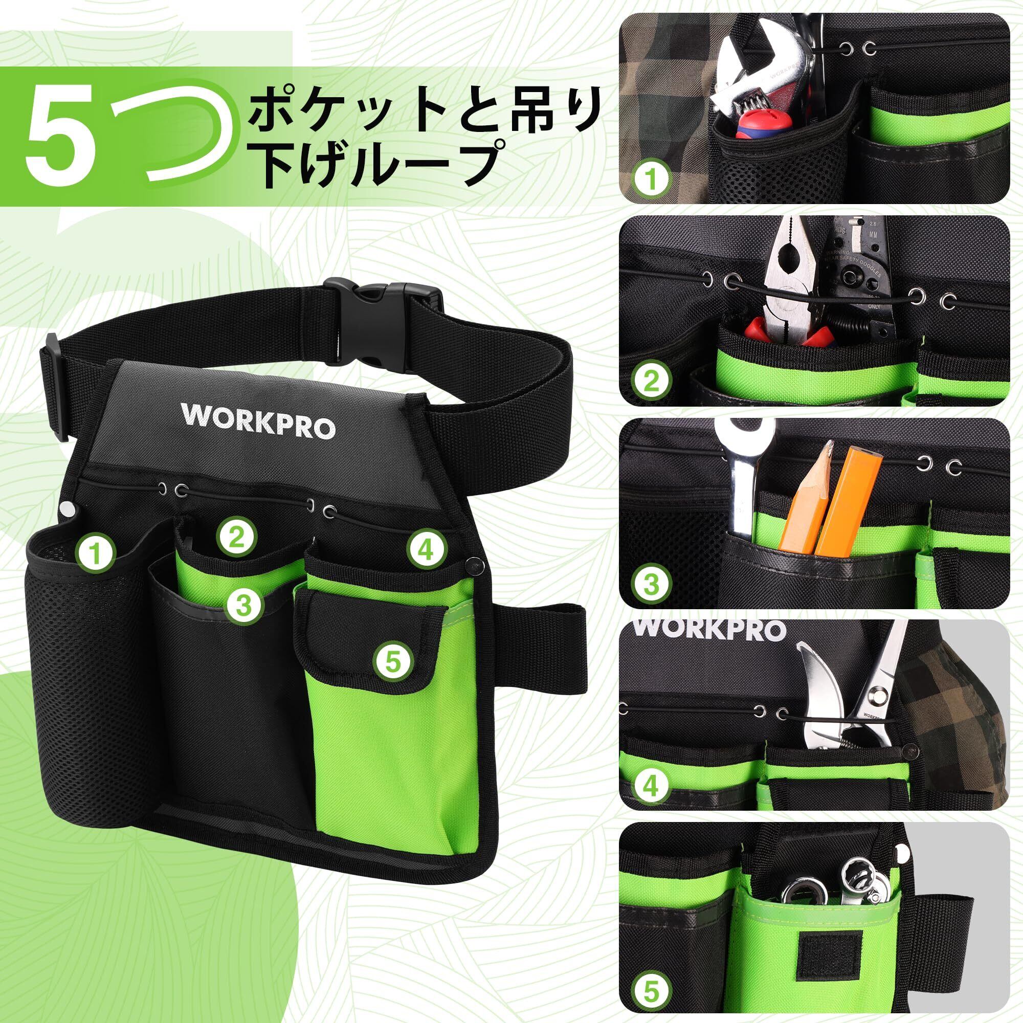 WORKPRO ガーデニングポーチ 園芸ポーチ 腰掛ポーチ 腰袋 600Dオックスフォード生地 多機能ポケット 剪定ばさみケース 園芸作業 大工 草取り 作業用 収納 持ち運び ベルト総長135cm サイズ調整可能 園芸ツール別売り