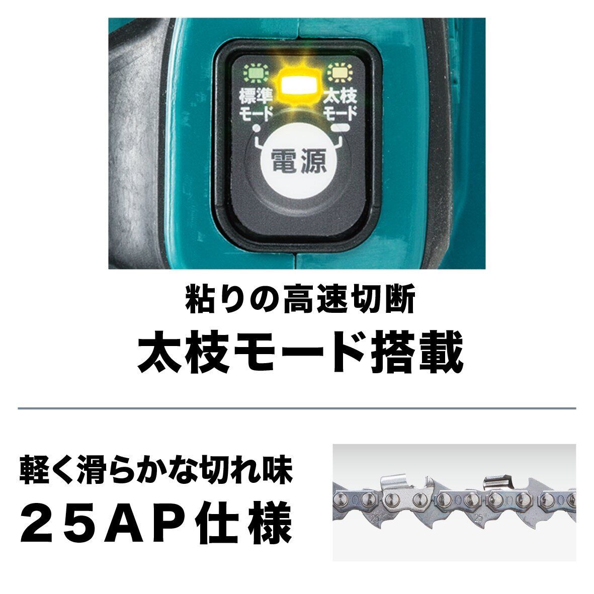 プロユースに最適な、優れた機能性:粘りの高速切断「太枝モード(直径10cm目安)」搭載。チェーン形式:25AP仕様。優れた重心バランスにより軽い取り回し感。「収納式」オイルタンクキャップにより枝の引っ掛かりを低減。