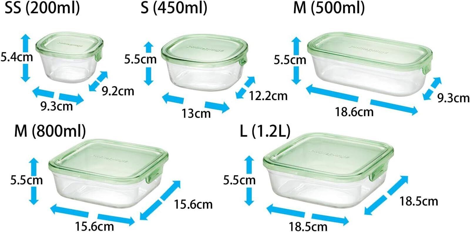 セット内容 : 満水容量200ml(幅9.3×奥行9.2×高さ5.4cm)×2個満水容量450ml(幅13×奥行12.8×高さ5.5cm)×2個満水容量800ml(幅15.6×奥行15.6×高さ5.5cm)×2個満水容量1.2L(幅18.5×奥行18.5×高さ5.5cm)×2個箱寸法 : 幅35×奥行29×高さ12.5cm