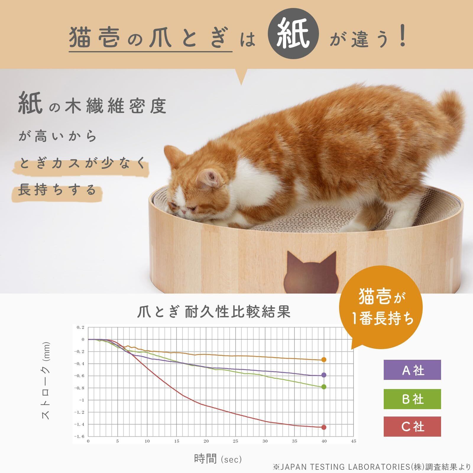 【"直径48cm"XLサイズ】 猫壱の大人気「バリバリボウル」から待望のXLサイズが登場です! 通常サイズ直径40cmから、大きくサイズアップした直径48cmのXLサイズ。体重6kg超えの大きな猫でものびのび使える嬉しいサイズです。高さは通常サイズと同じ12cm。高すぎない段差で、上り下りの負担もなく、お部屋に置いた時の圧迫感も軽減します。 【からだフィット形状】 つめとぎ兼ベッド部分はダンボール製。重なりあった薄いダンボールが、土台に沿ってきれいなすり鉢状を作ります。猫のやわらかいからだにフィットするので、猫がリラックスできます。 【つめとぎ部分は交換可能】 バリバリボウルの特徴であるつめとぎ部分のみの交換可能です。交換用つめとぎ(別売り)。 猫のつめとぎは消耗品だからこそ、長く使っていいただけるよう、工夫しています。 【あたたかな木目調シートデザイン】 48m×48cmの大型サイズだからこそ、お家のインテリアを邪魔しないシンプルな木目調デザインとなっています。猫のフェイスマークと肉球の足跡入で可愛さもプラスしました。 ※外枠はダンボール板製です。木製ではございませんのでご注意ください。 【こだわり抜いた原材料】 つめとぎ部分に使用しているダンボールは、原料の100%が紙です。内10%はニュージーランド産原パルプ紙を使用。大切な猫に使用するつめとぎなので、品質にはとことんこだわりました。 【高密度ダンボールで長持ち】 つめとぎ部分はダンボールのシートを巻いていき円形にしています。薄いダンボールを使用しているので、密度が高く、猫のとぎ甲斐アップだけでなく、耐久性も持たせています。