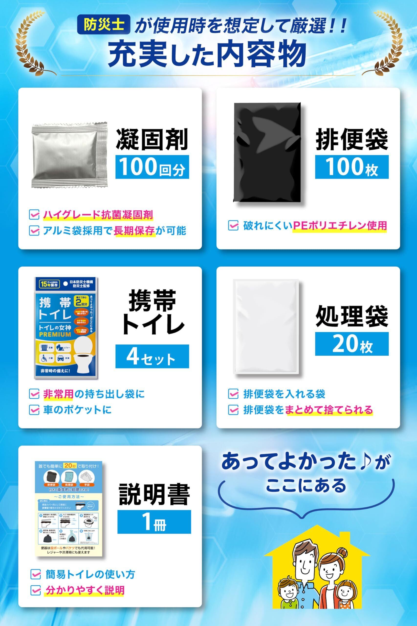 どこでも簡単トイレ トイレの女神PREMIUM 簡易トイレ 【2人~4人世帯向けに防災士が監修】 100回分 15年保存&日本製 携帯トイレ 防災トイレ 非常用トイレ 携帯トイレセット